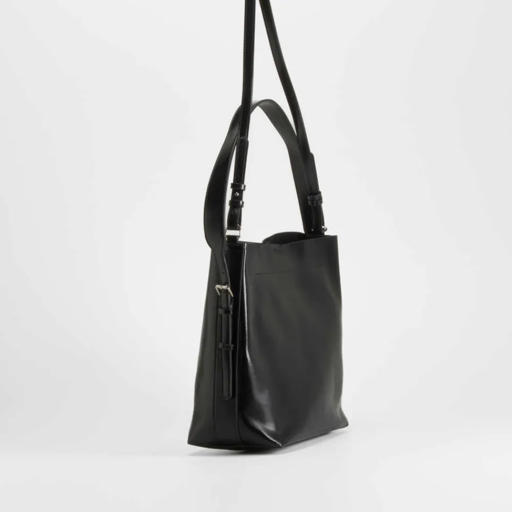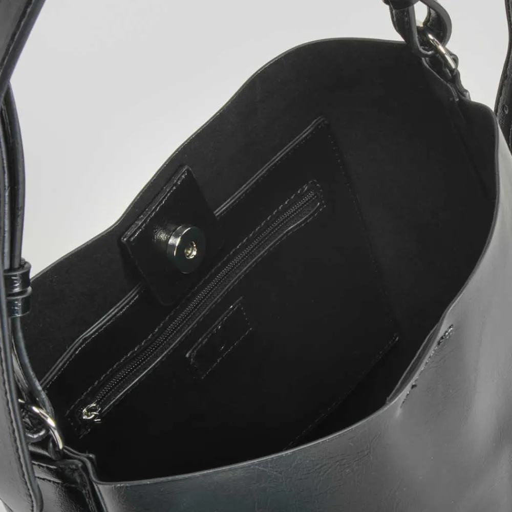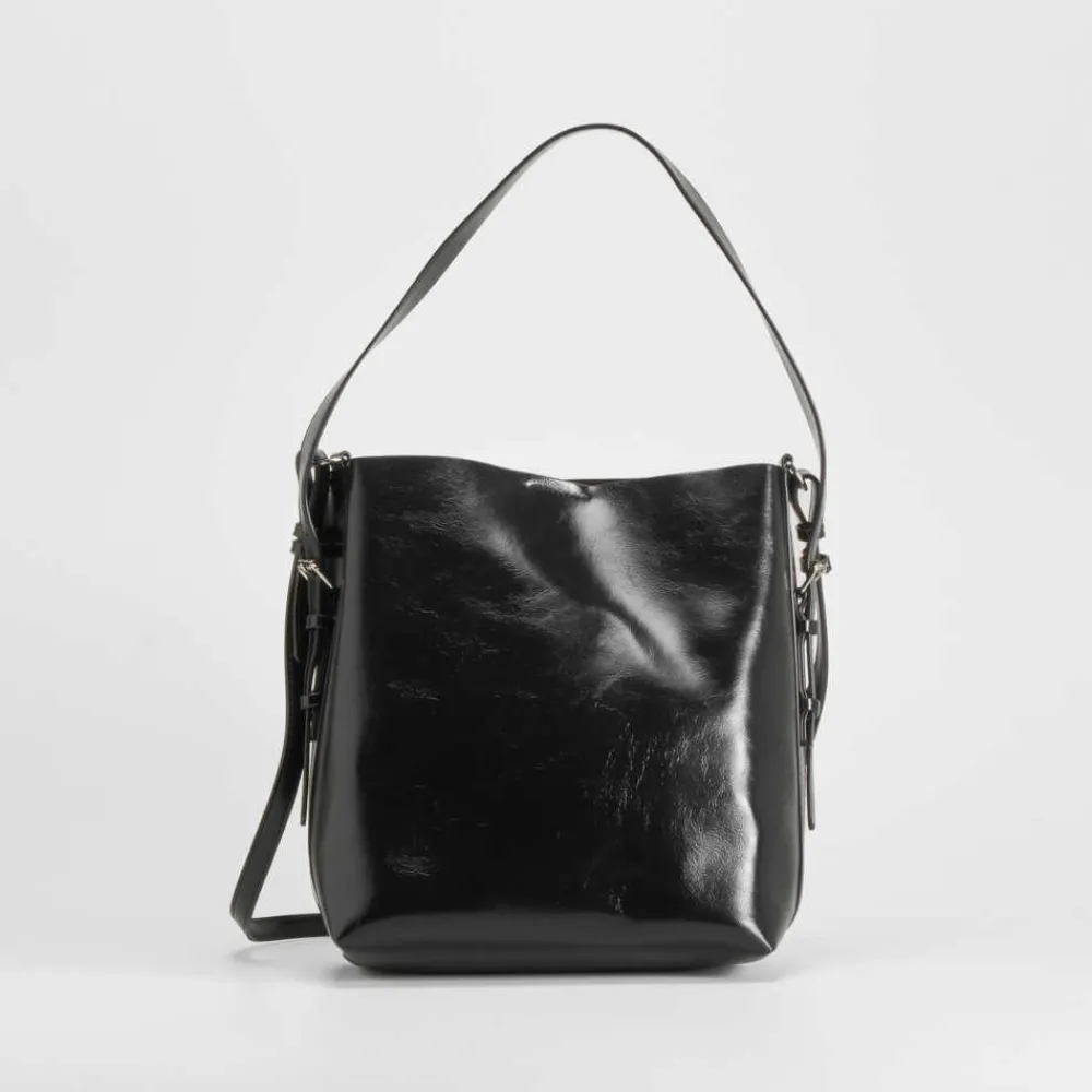 Bolso de hombro con diseño elegante en color negro, destaca por su acabado brillante y estructura rectangular que aporta sofisticación a cualquier conjunto. Su asa larga permite llevarlo cómodamente durante el día. La marca PICCOLA PIU añade un toque de distinción y estilo.
