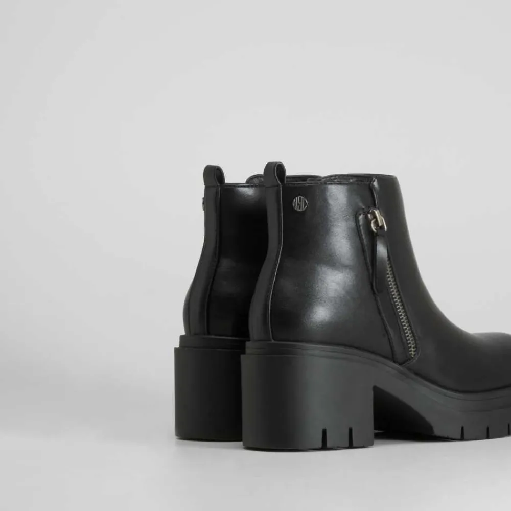 Botín bajo con cremalleras de la marca NYC para mujer. Corte en color negro con un tirador en la parte posterior. Tacón de 7cm de altura.