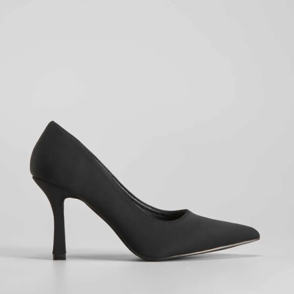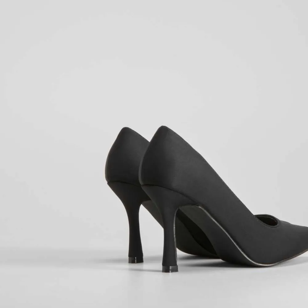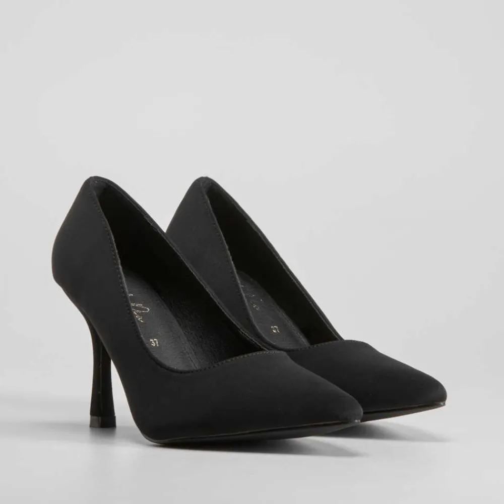 Zapato de salón negro de la marca PICCOLA PIU. Modelo satinado acabado en punta. Tacón fino de 9cm de altura.