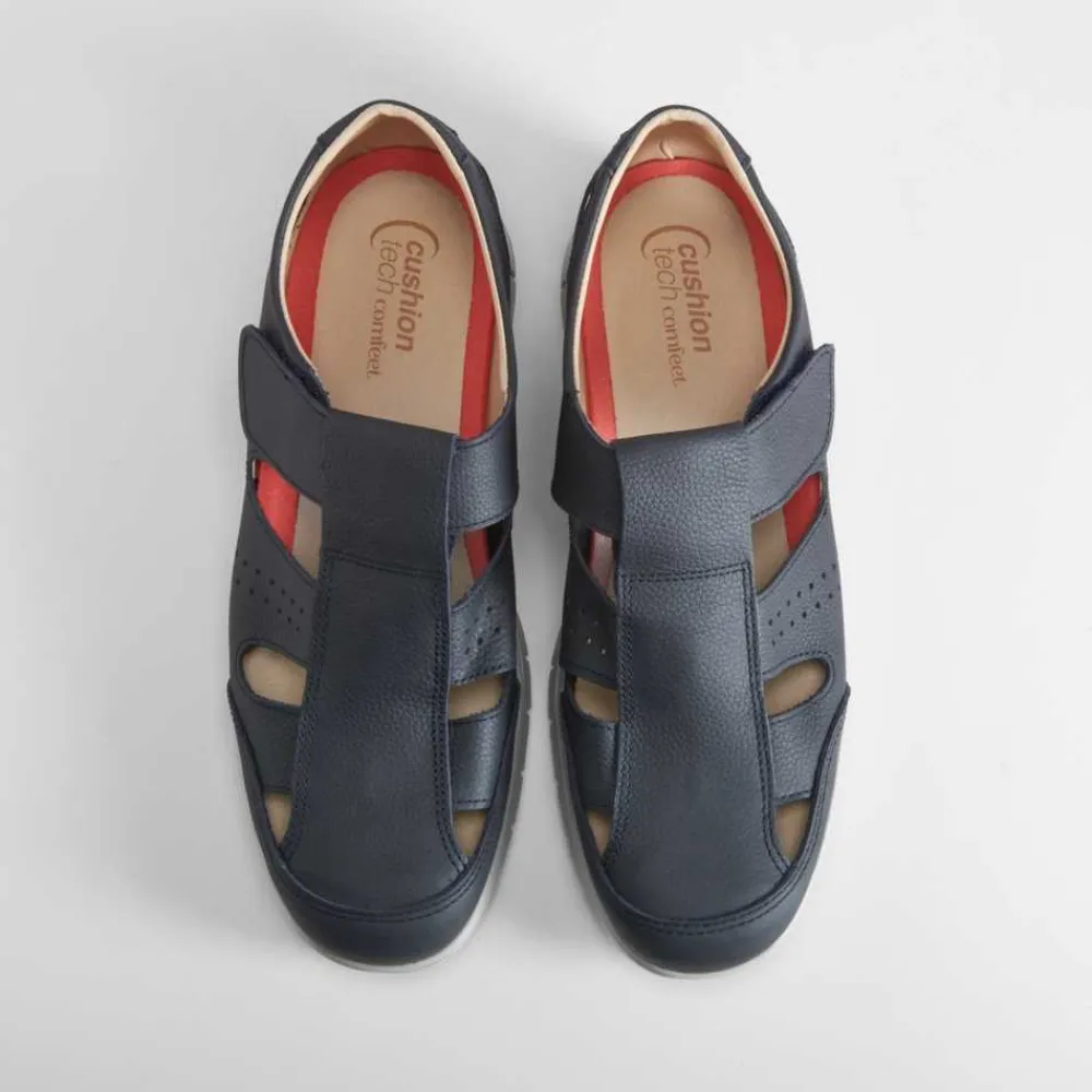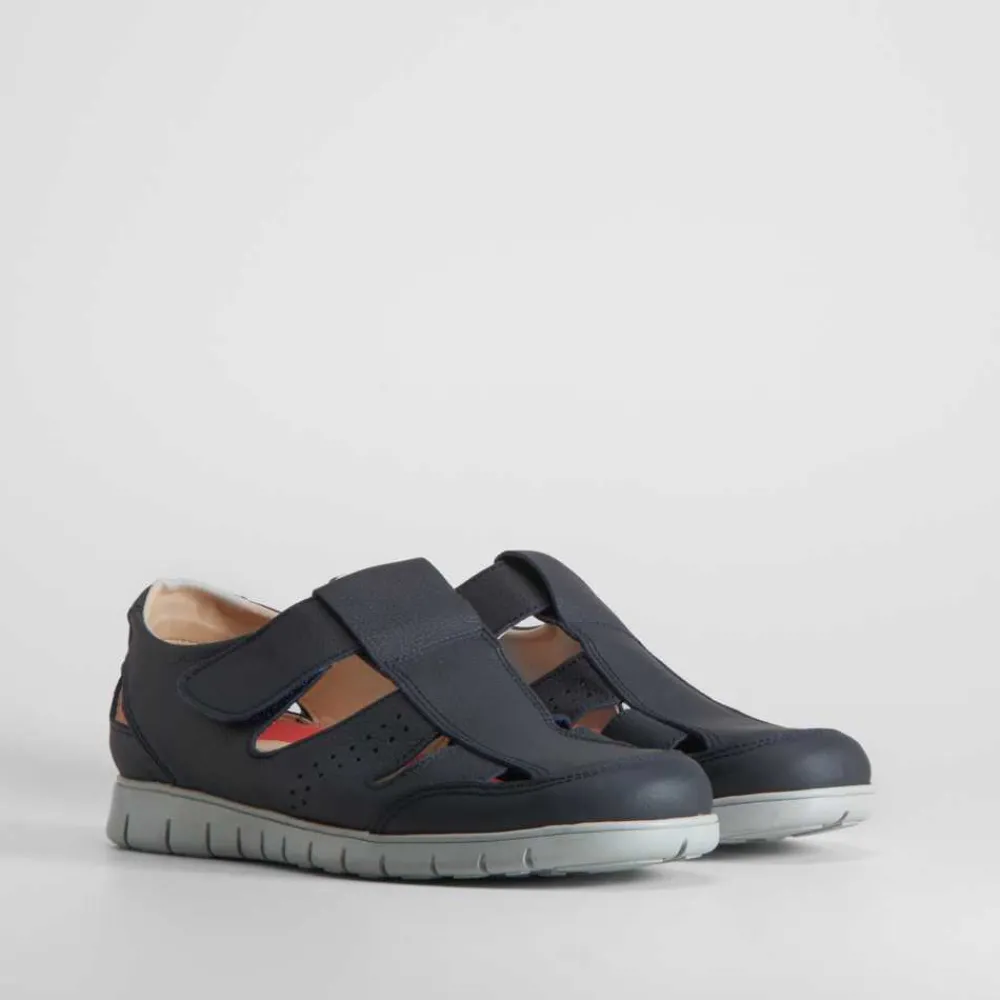 Sandalia cerrada de piel color azul para hombre de la marca COMFEET con un práctico cierre de velcro. Modelo flexible y confortable. Hecho en España.