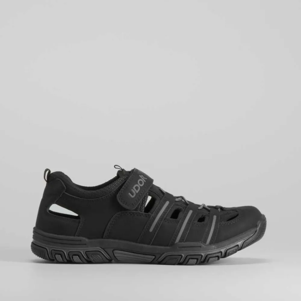 Sandalia negra cerrada de outdoor para hombre de la marca UDOK. Cordones elásticos y cierre de velcro para un calce más sencillo y mayor sujeción.