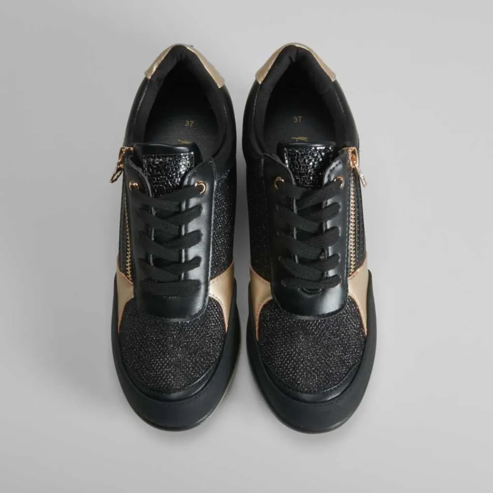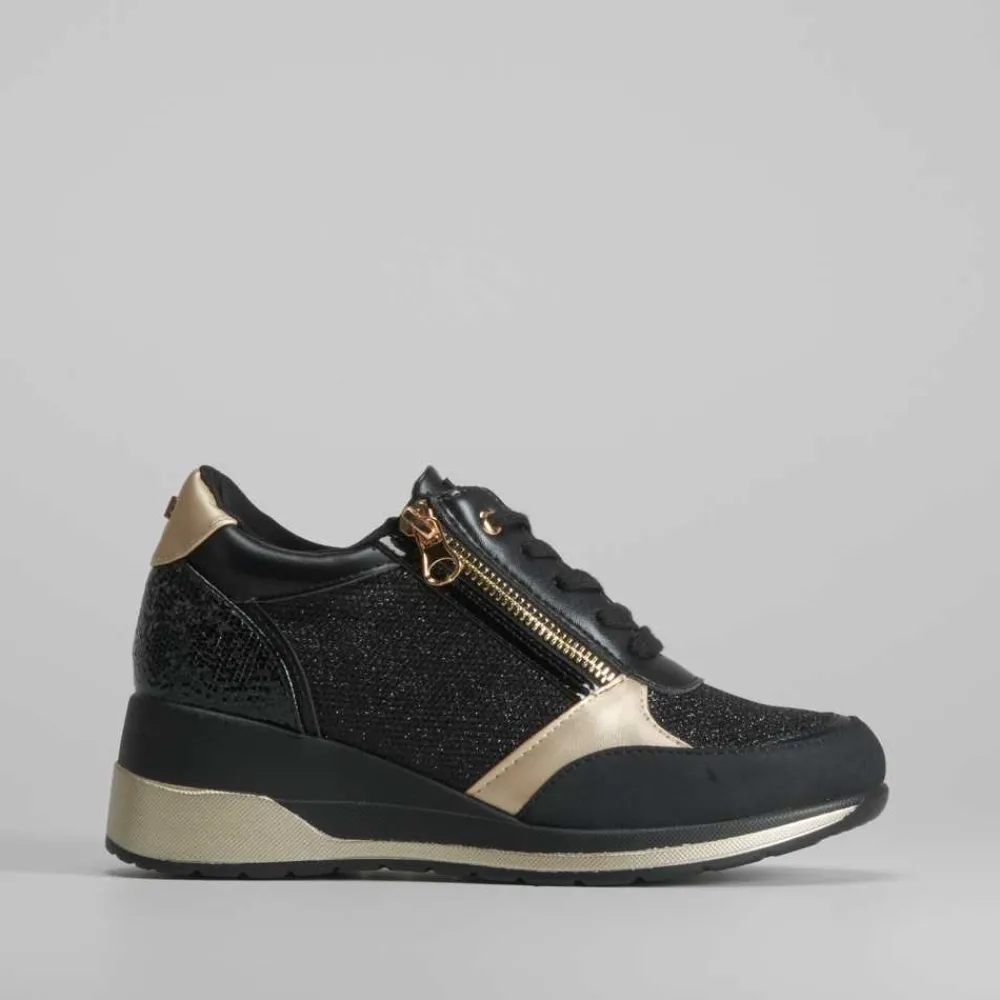 Sneaker con cuña para mujer de la marca PICCOLA PIU. Corte en color negro con acabados brillantes, cremallera metalizada y cierre de cordones. Cuña de