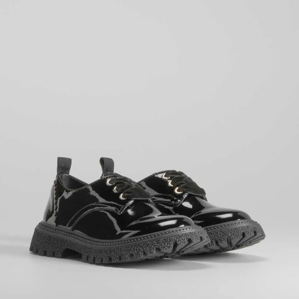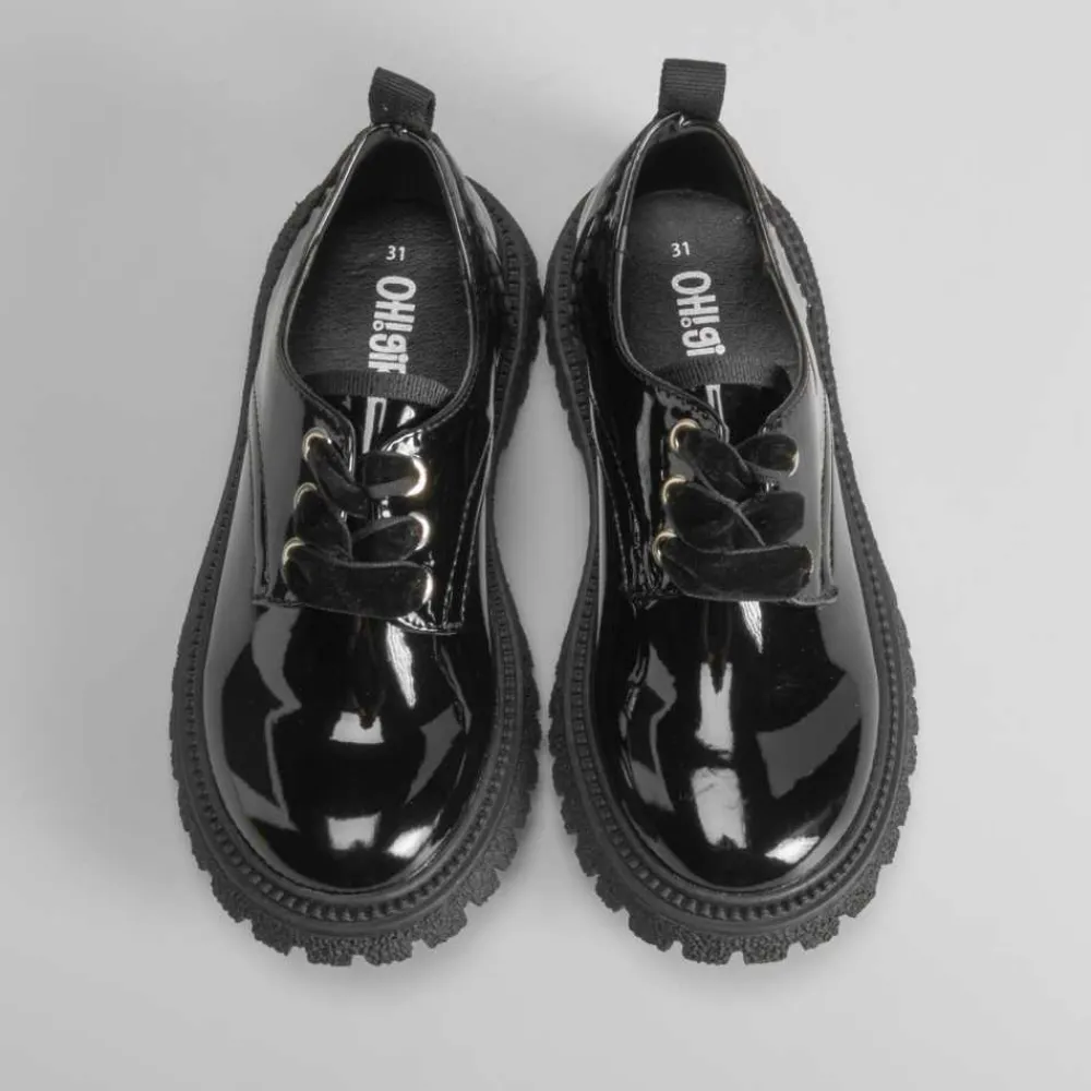 Blucher en charol para niñas de la marca OH GIRL. Corte en color negro con cordones aterciopelados y suela dentada.