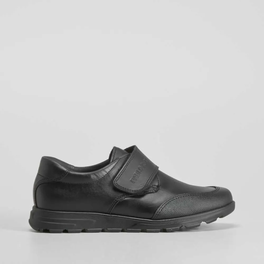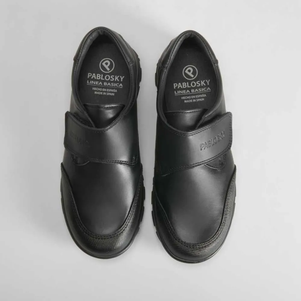 Zapato colegial de PABLOSKY confeccionado en piel en color negro. Tira de velcro ancha y puntera reforzada.