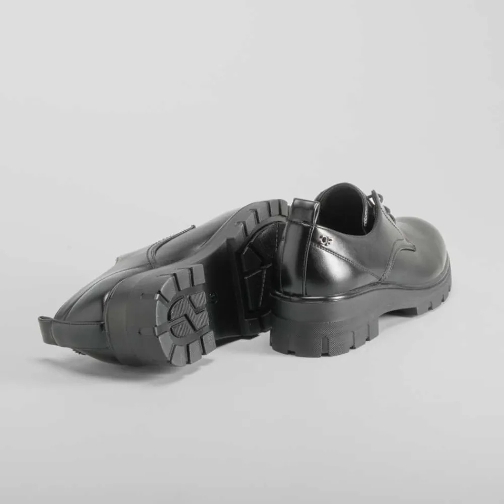Blucher negro de tacón ancho y bajo de la marca COMFEET. Modelo cordones encerados y tirador en la parte posterior.