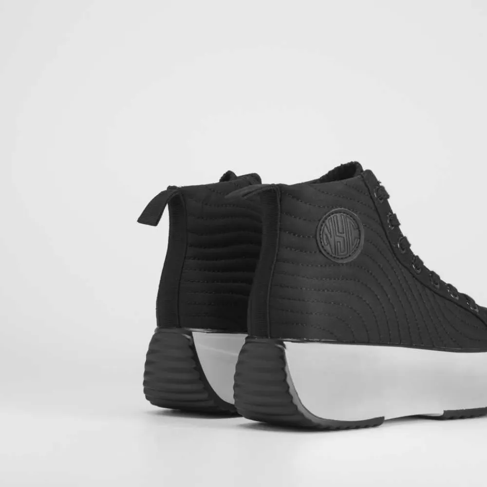 Botín deportivo para mujer de la marca NYC. Exterior en color negro, cierre de cordones combinados, suela con plataforma contrastada y tirador trasero. SERIE R: Interior textil 50% reciclado.