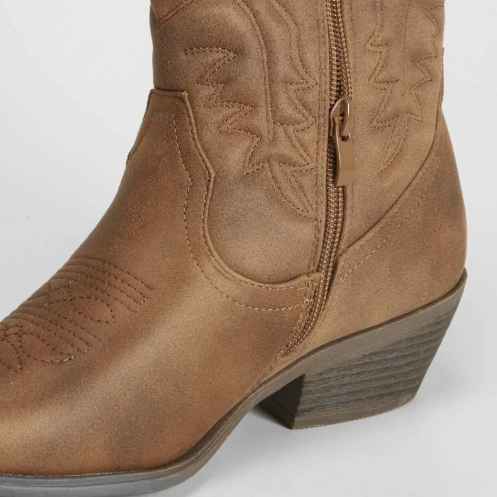Bota campera alta para mujer de la marca NYC. Exterior grabado en color beige con pespuntes combinados y cierre de cremallera lateral. Suela con tacón bajo.