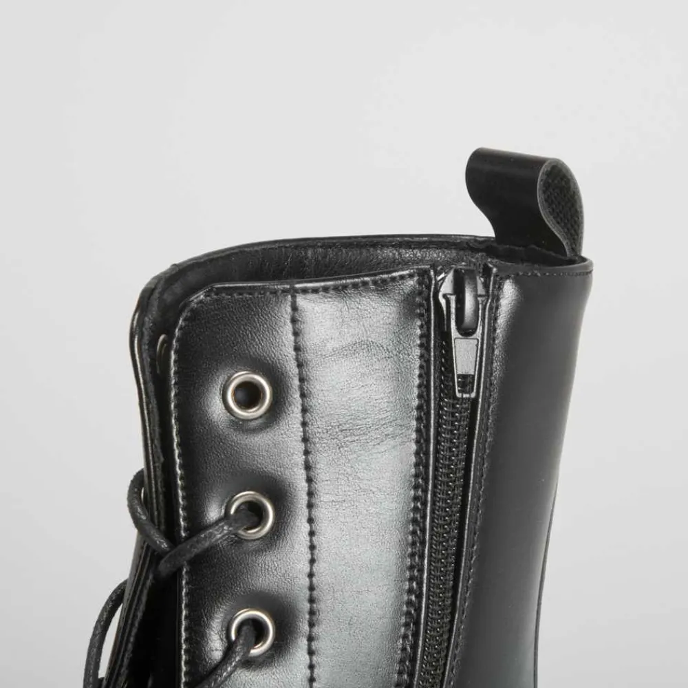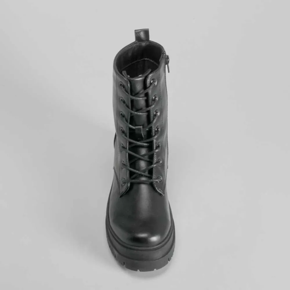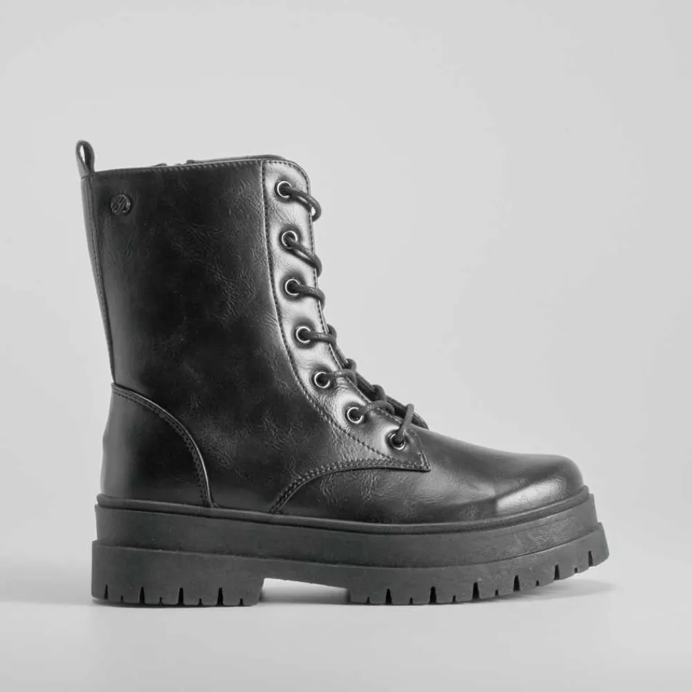 Botín negro con plataforma de estilo militar de la marca NYC. Cierre de cordones entonados y cremallera lateral para un calce más rápido.