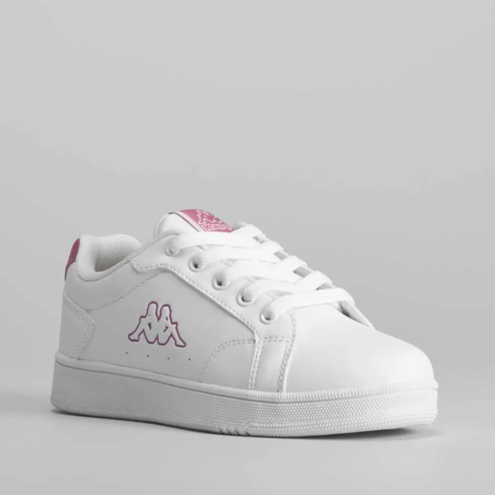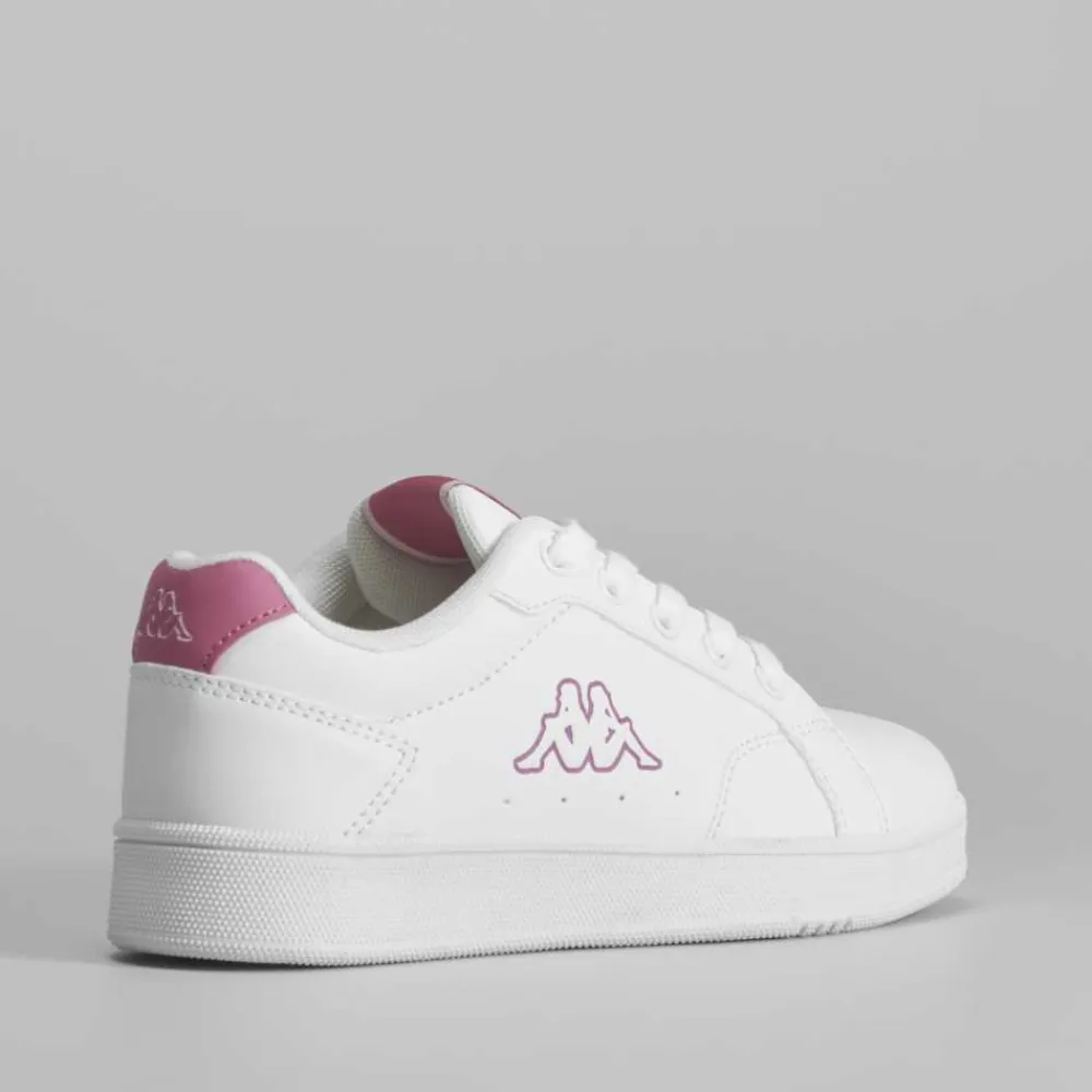 Zapatilla tenis de KAPPA para niños en color blanco. Modelo clásico con cierre de cordones y detalles contrastados en rosa.