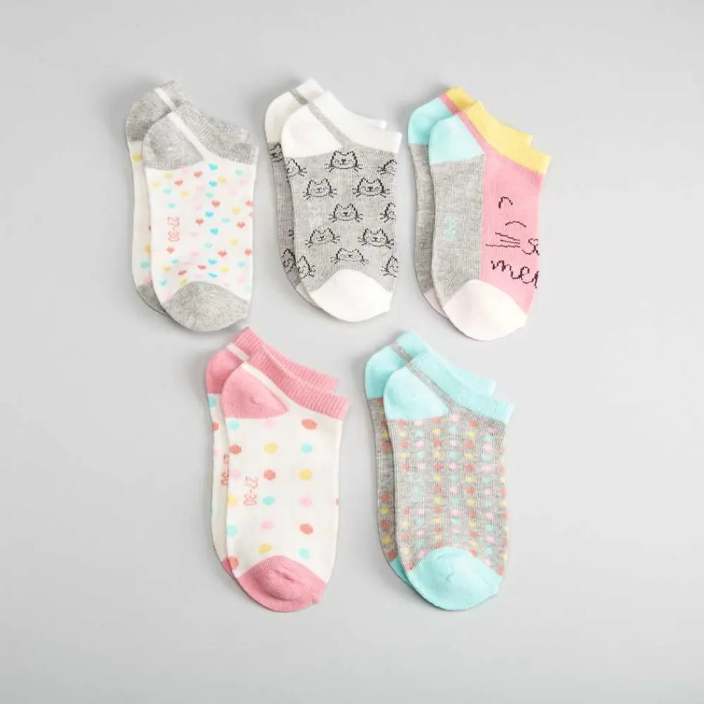 Pack de cinco pares de calcetines invisibles de la marca MERKAL con estampado de gatitos y varios colores.