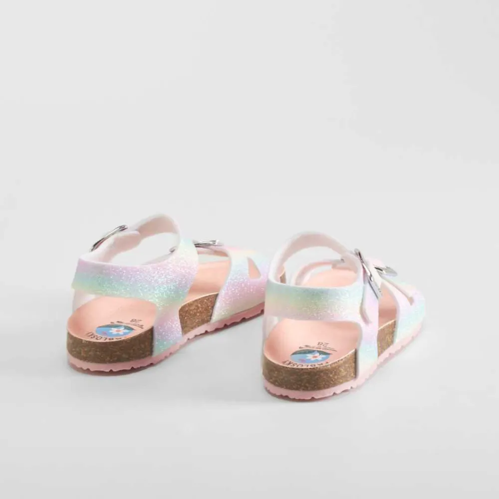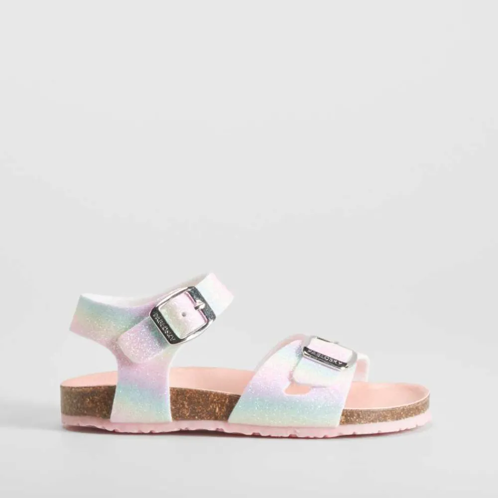 Sandalia bio para niñas de glitter multicolor de la marca PABLOSKY. Modelo confeccionado con materiales reciclados y cierre de hebilla. Planta de corcho flexible y absorbente para un mayor confort. Piso de goma flexible y antideslizante. Hecho en España.