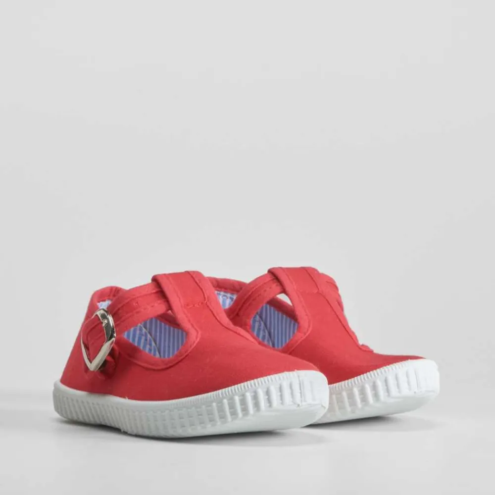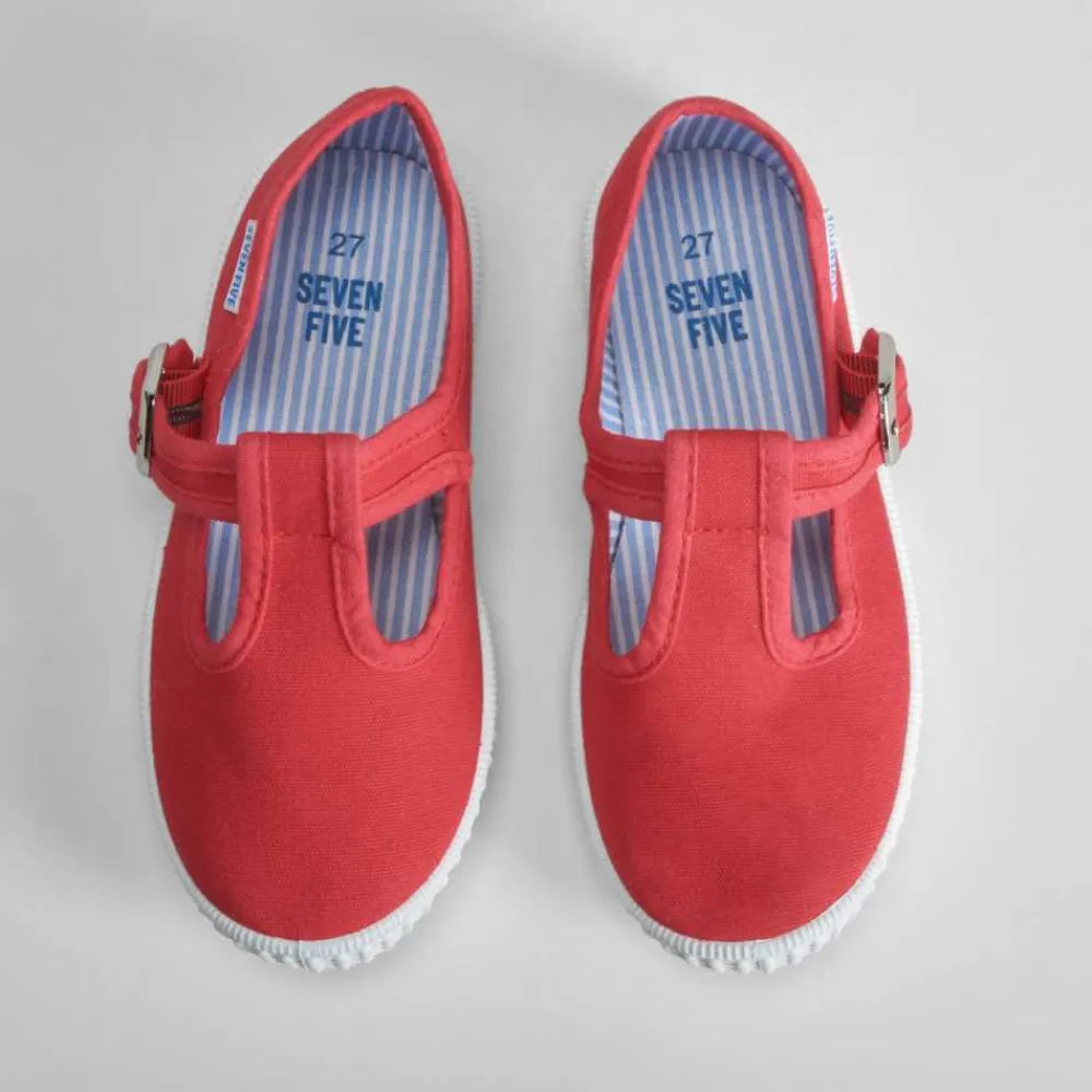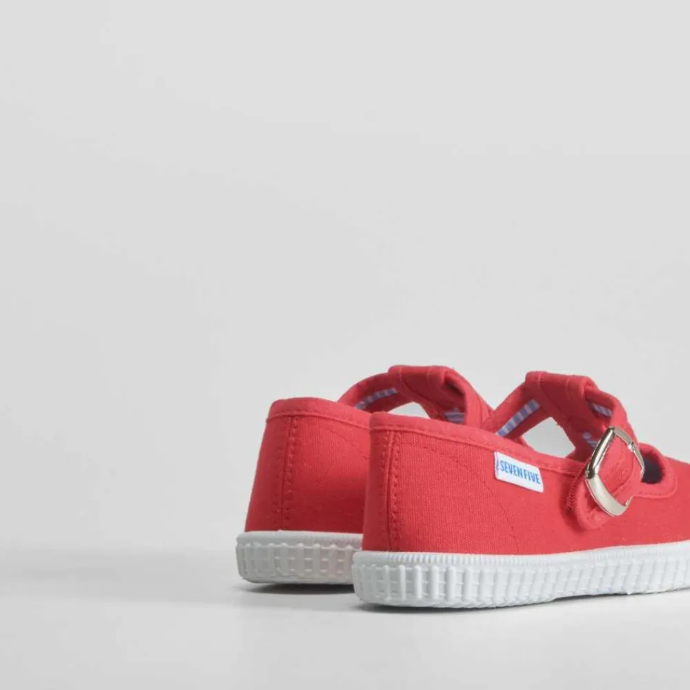 Sandalia cerrada de lona de la marca SEVEN FIVE. Modelo en color rojo con cierre de hebilla lateral ajustable y suela de goma.