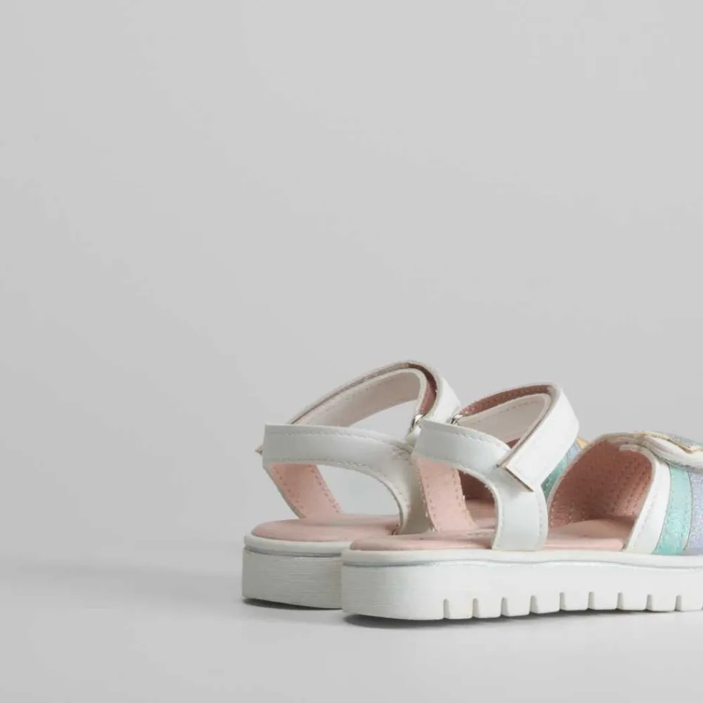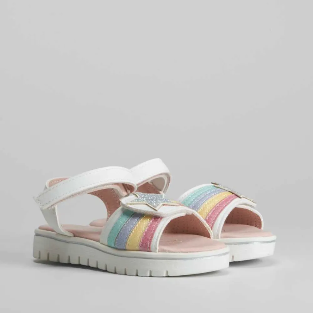 Sandalia infantil con plataforma de la marca OH GIRL. Tira de velcro en la pala y hebilla en el talón. Estrella de adorno y bandas de colores con brillo.
