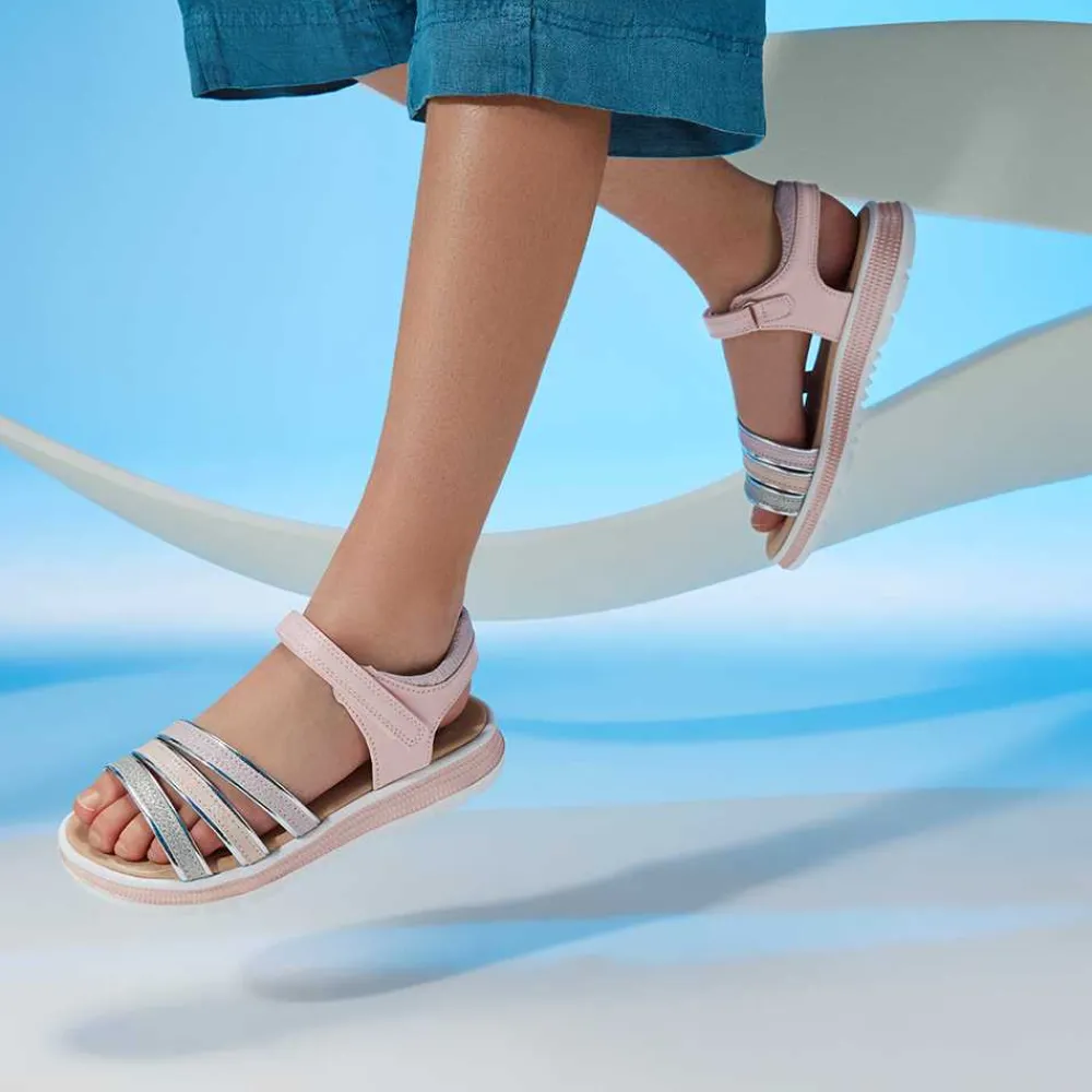 Sandalia rosa metalizada de la marca COMFEET KIDS para niñas. Pala con tres tiras en diferentes tonos y ribetes dorados y pulsera con velcro ajustable.