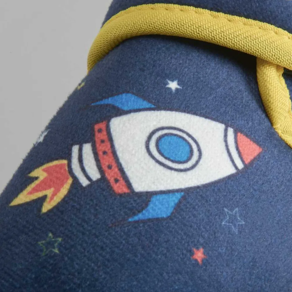 Zapatilla de estar en casa cerrada de la marca OLYNE para niños. Corte en color azul con ribetes amarillos, una tira de velcro y puntera adornada con print. Suela flexible de goma.