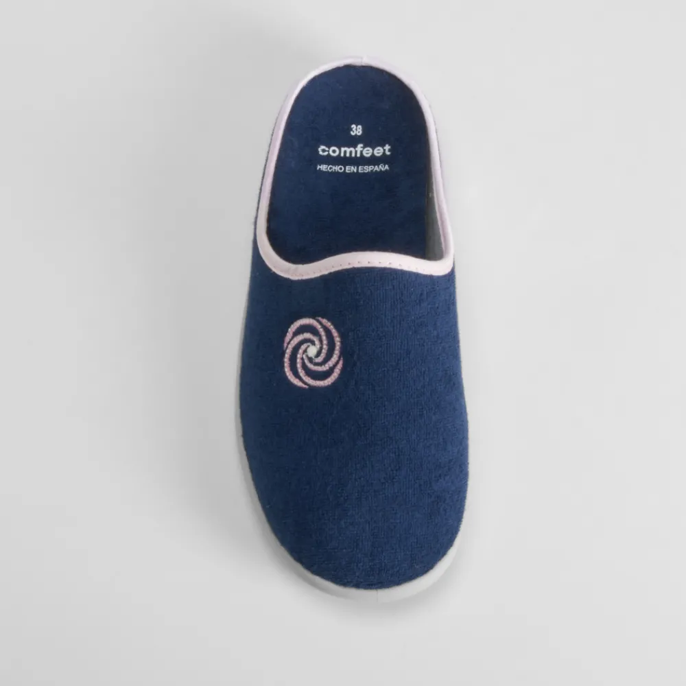 Disfruta del máximo confort con las zapatillas de casa abiertas de COMFEET, confeccionadas en rizo azul marino para una sensación de suavidad y calidez en cada paso. Su diseño ergonómico con bordado decorativo aporta un toque elegante y acogedor, mientras que su plantilla extraíble permite un ajuste óptimo y mayor comodidad. Además, están fabricadas en España, asegurando calidad y durabilidad en cada detalle.