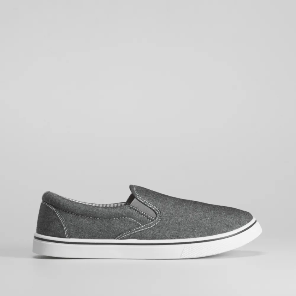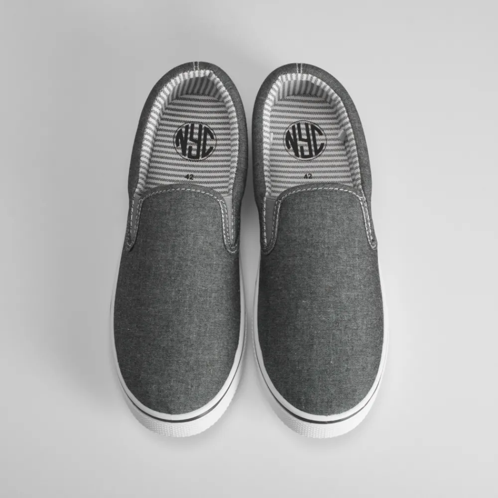 Zapatilla slip on básica de NYC para hombre. Exterior en color gris oscuro con cosidos contrastados y dos elásticos cómodos y funcionales. Cuello acolchado y piso de caucho.