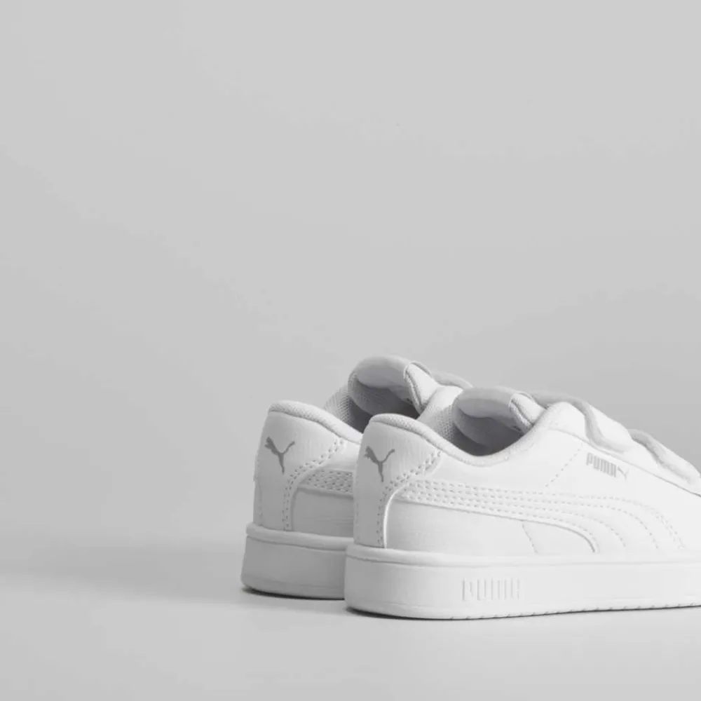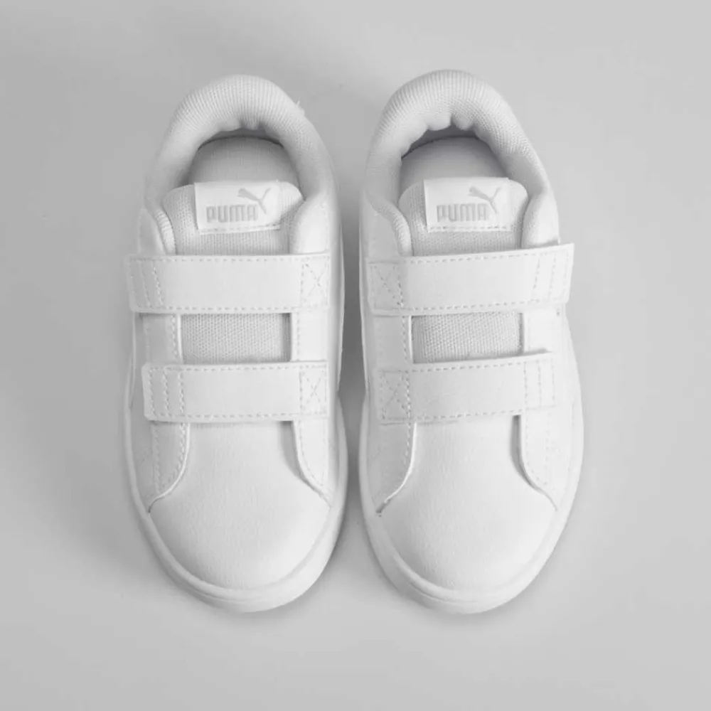 Tenis blanco con velcros de PUMA para niños. Modelo con dos tiras de velcro y logo combinado en el lateral.