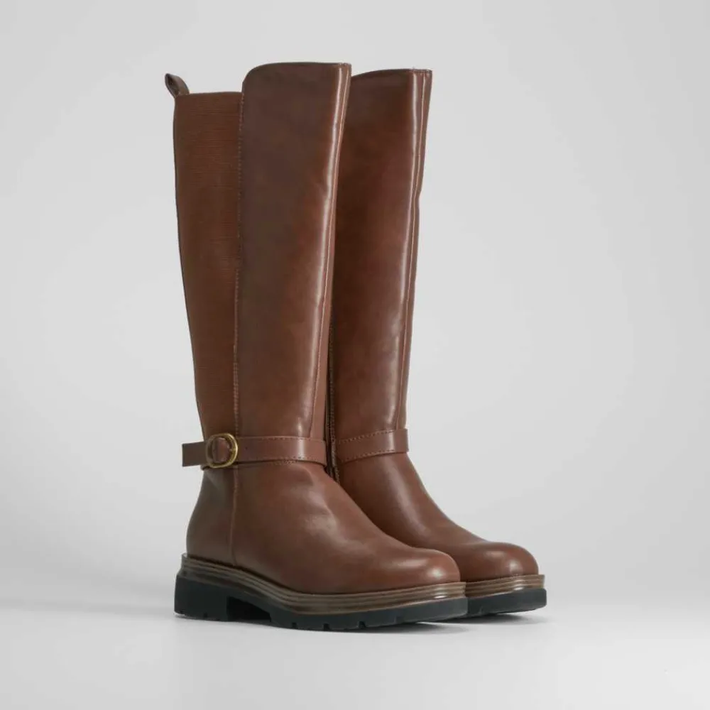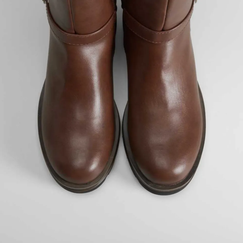 Bota plana COMFEET en color marrón oscuro, ideal para un estilo sofisticado y cómodo.
