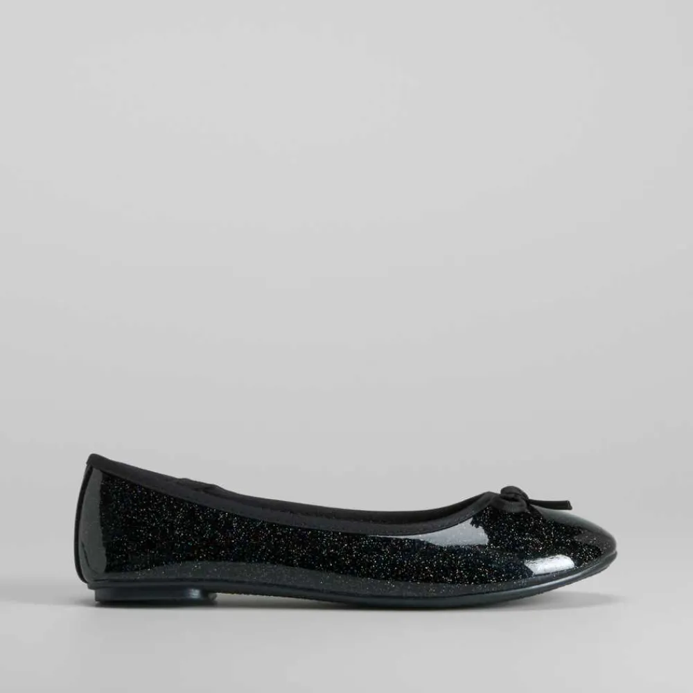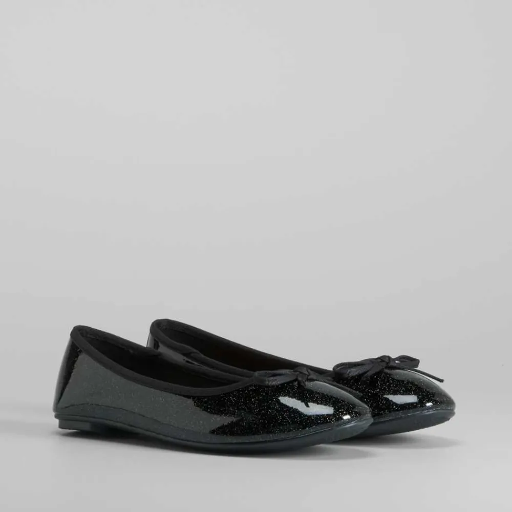 Bailarina básica infantil de la marca OH GIRL. Modelo en color negro con acabado brillante y lazo de adorno en la puntera.
