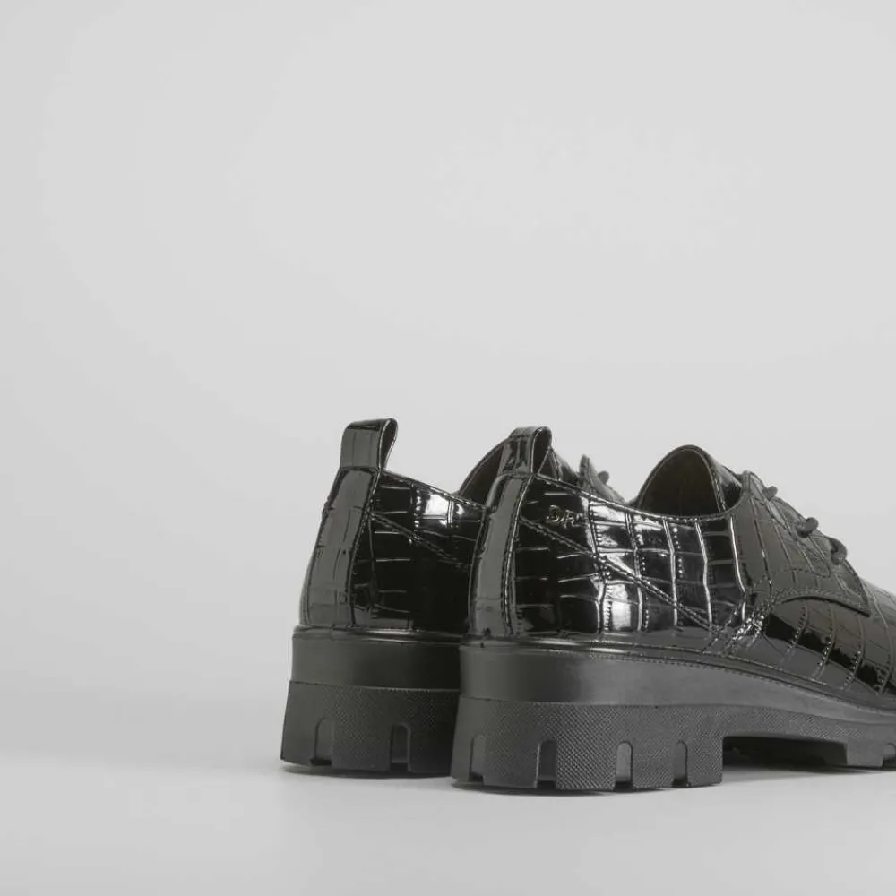 Blucher de tacón cuadrado en color negro de la marca COMFEET. Modelo con cordones, tirador trasero y grabado de coco en charol. Tecnología Soft Insock: La plantilla Soft Insock se adapta a la forma natural de la pisada, descansando mientras caminas gracias a su diseño anatómico High Intensity Foam que permite recuperar su forma en cada paso.