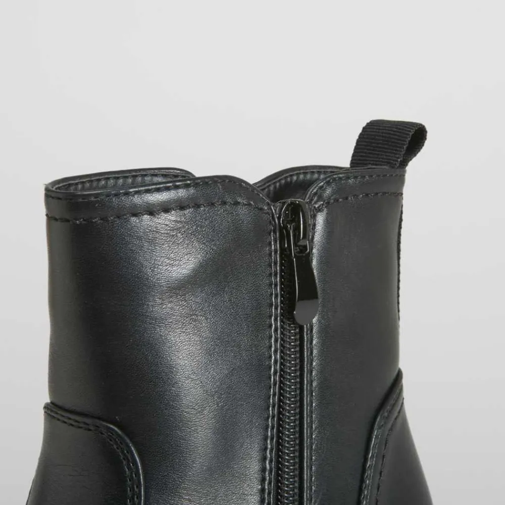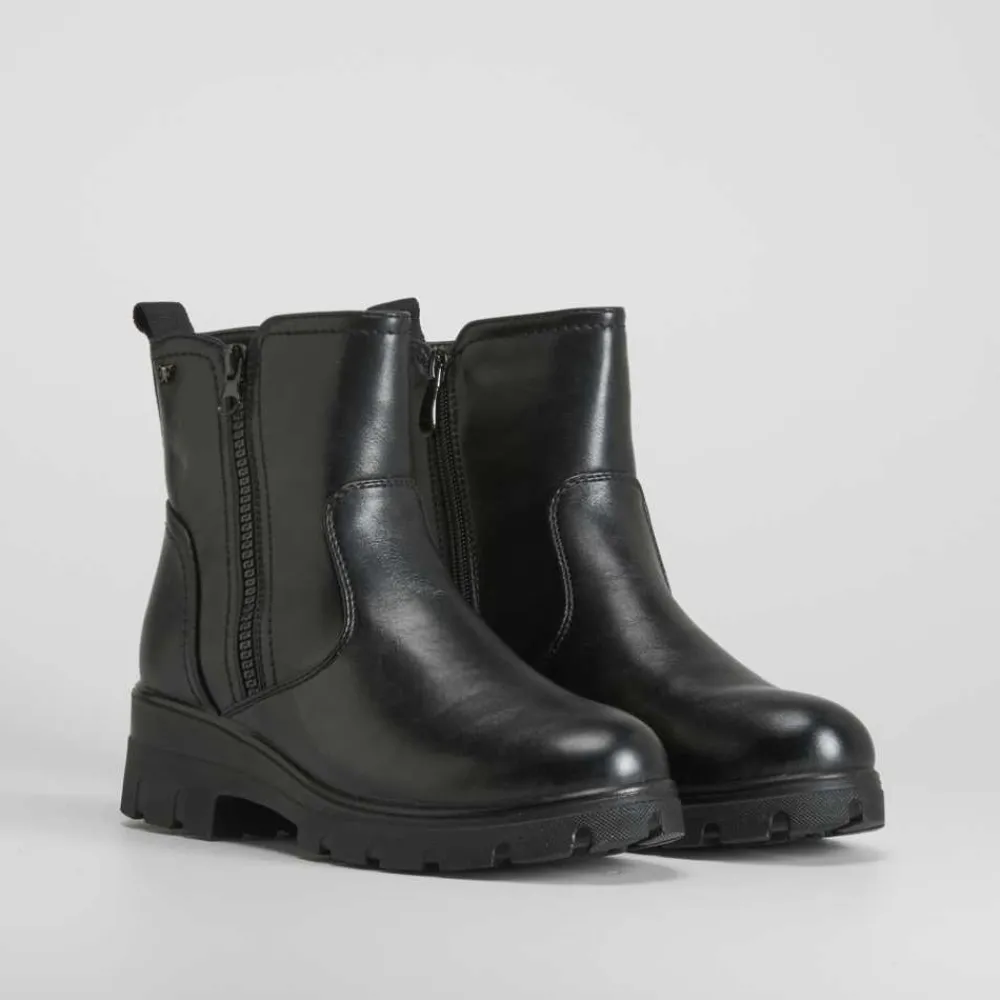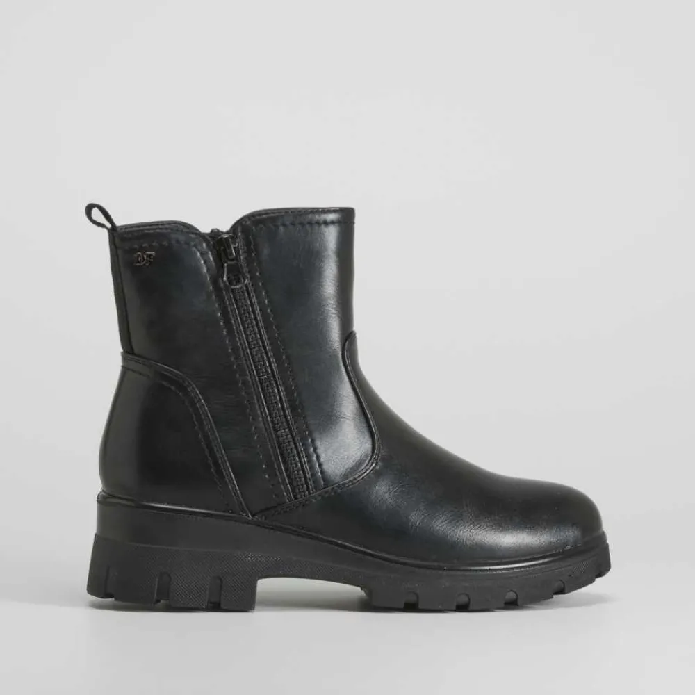 Botín negro básico con cremalleras de la marca COMFEET para mujer. Diseño muy ligero y flexible para mayor comodidad. Incorpora dos cremalleras y un tirador en la parte posterior. Tecnología Soft Insock: La plantilla Soft Insock se adapta a la forma natural de la pisada, descansando mientras caminas gracias a su diseño anatómico High Intensity Foam que permite recuperar su forma en cada paso.