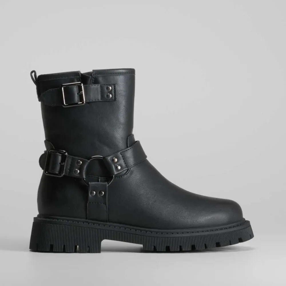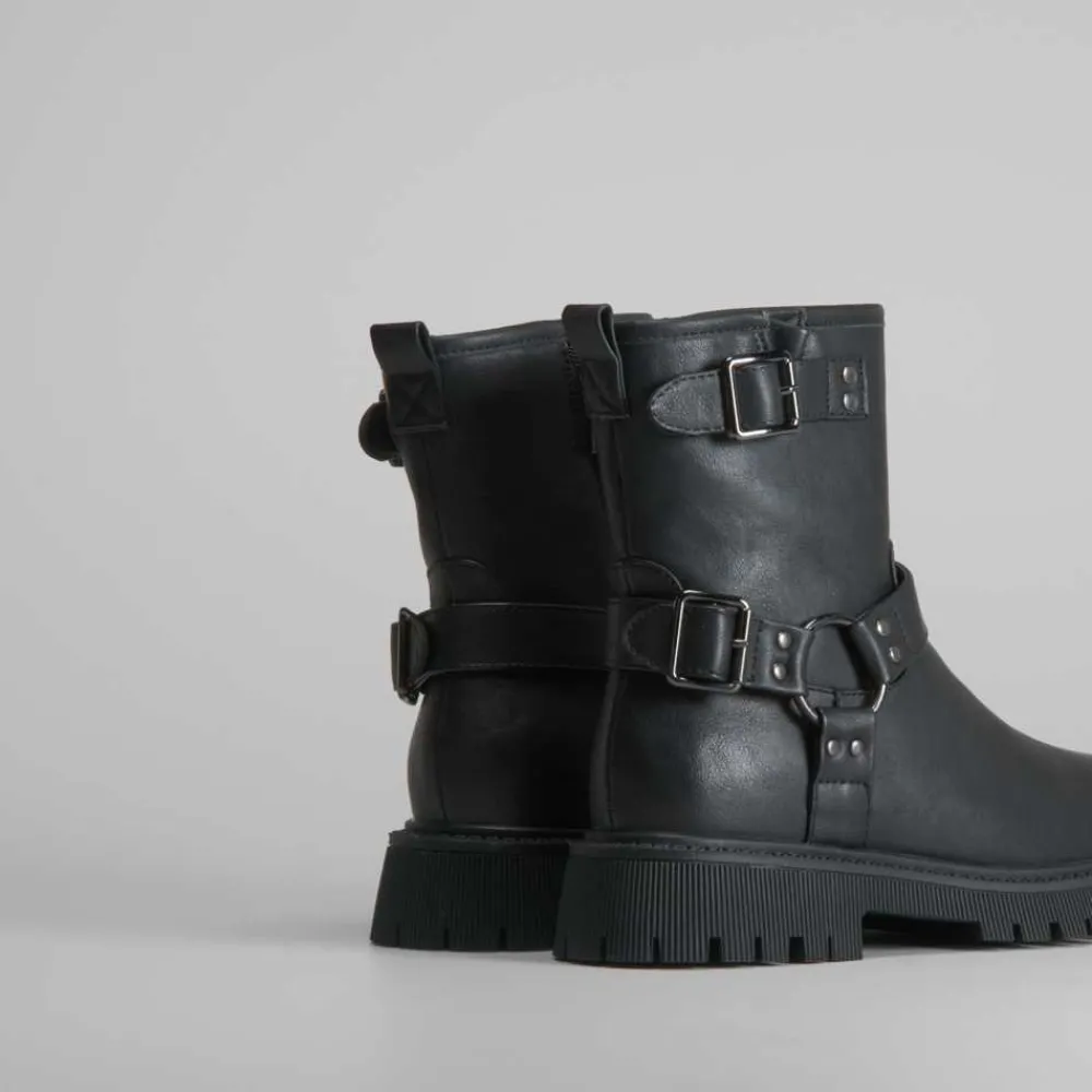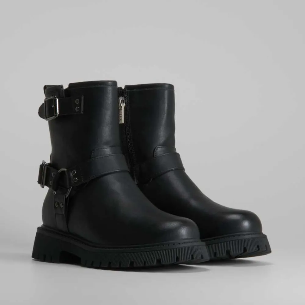 El botín biker con hebilla de XTI es una bota cómoda diseñada para el día a día. Confeccionada en polipiel y con un detalle de hebillas, su suela es dentada y cuenta con cierre de cremallera.
