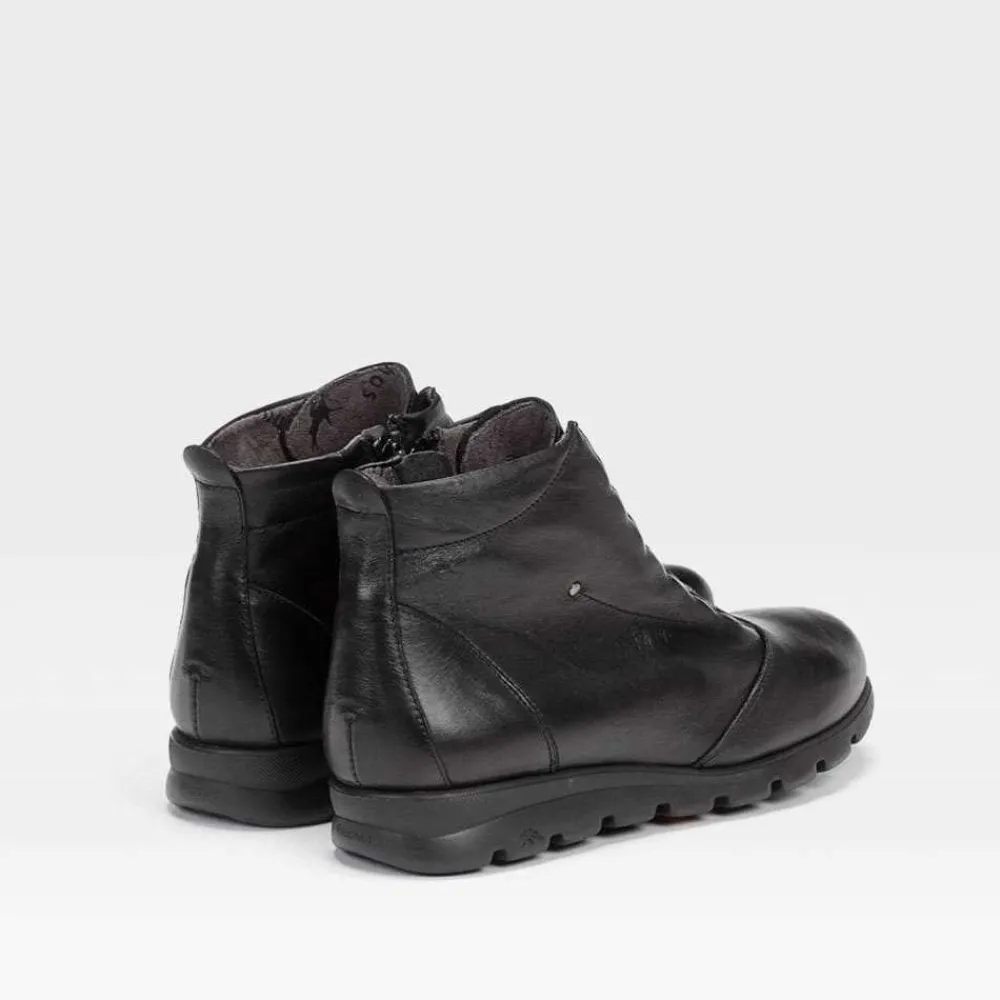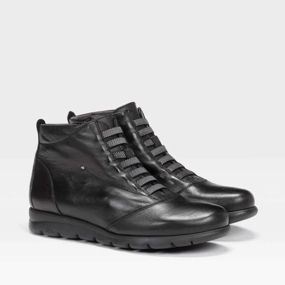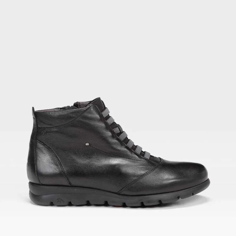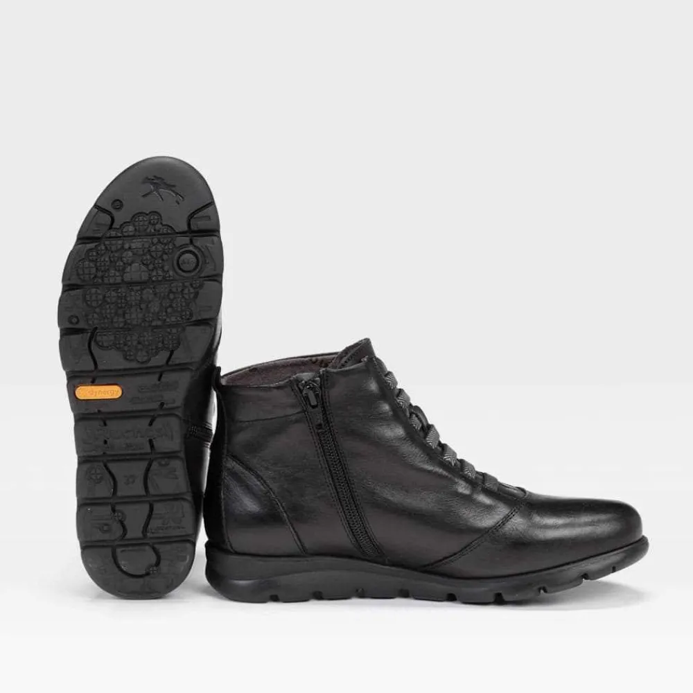 Botín plano de estilo deportivo de la marca FLUCHOS para mujer. Exterior confeccionado en piel en color negro con cordones elásticos y cierre de cremallera interior. Tecnología Dynergy que dota a la suela de flexibilidad, confort y ergonomía. Hecho en España.