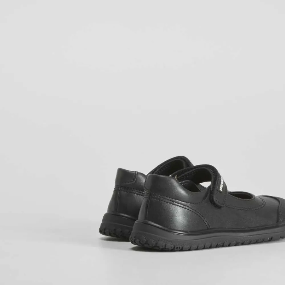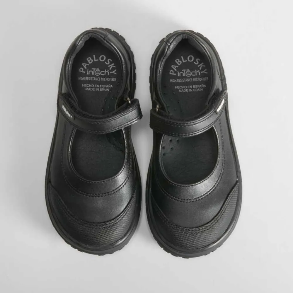 Mercedita colegial de PABLOSKY en piel de color negro para niñas. Puntera reforzada y tira de velcro ajustable.