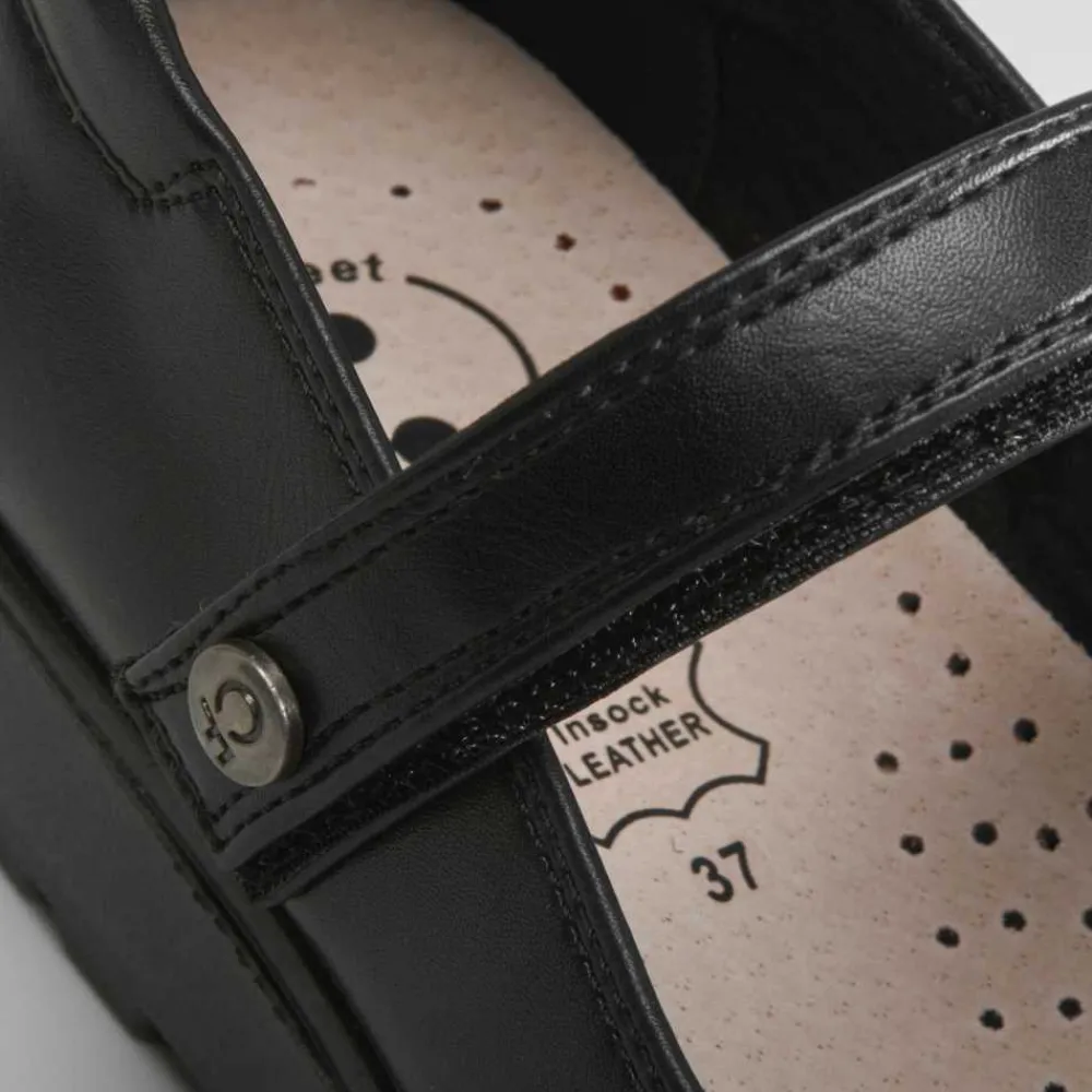 Mercedita de cuña baja en color negro de la marca COMFEET. Diseño ligero y confortable con una tira de velcro en el empeine para una mayor sujeción. Tecnología Soft Insock: La plantilla Soft Insock se adapta a la forma natural de la pisada, descansando mientras caminas gracias a su diseño anatómico High Intensity Foam que permite recuperar su forma en cada paso.