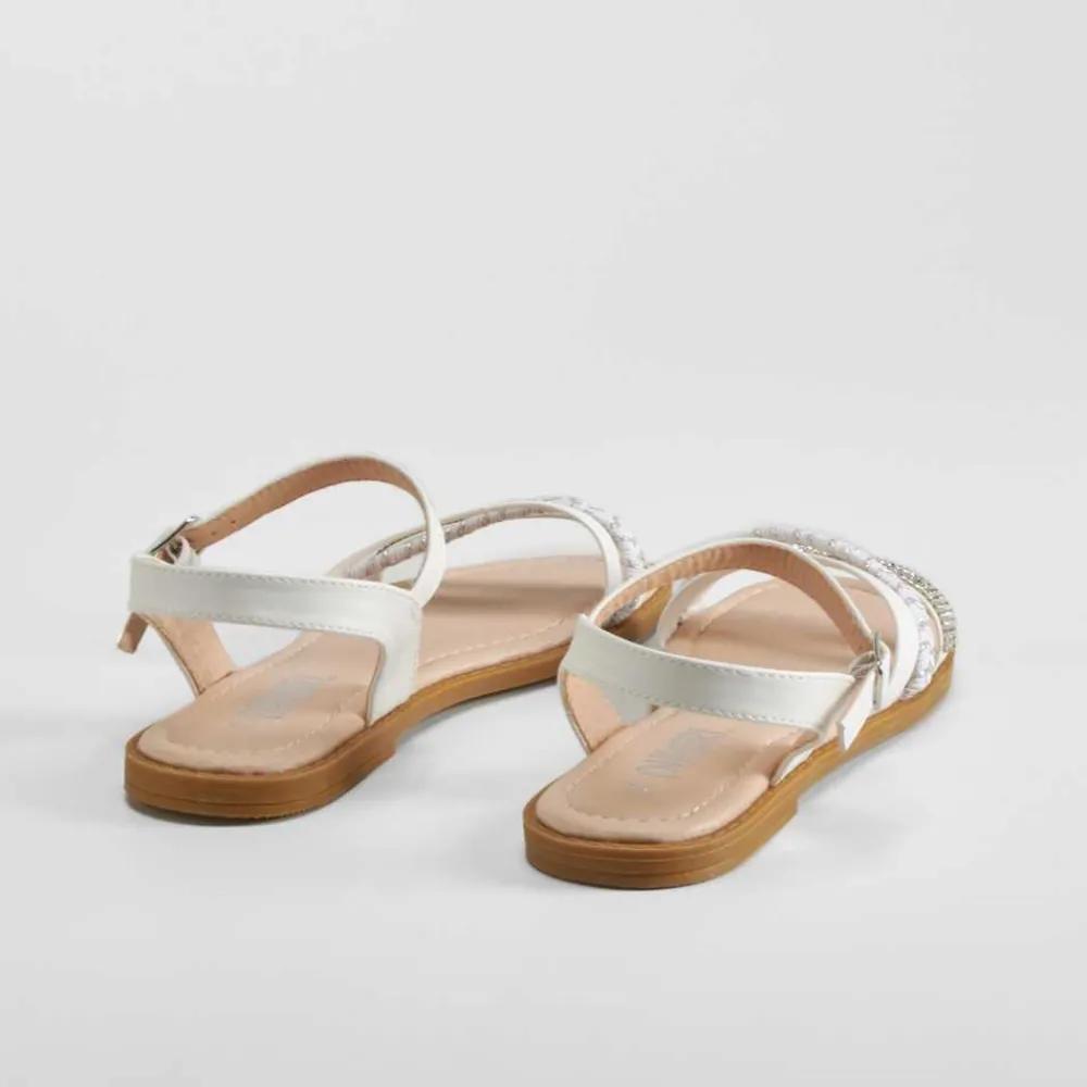 Sandalia plana infantil en color blanco de la marca OH GIRL. Pala adornada con tiras combinadas en diferentes materiales y acabados. Cierre de hebilla.