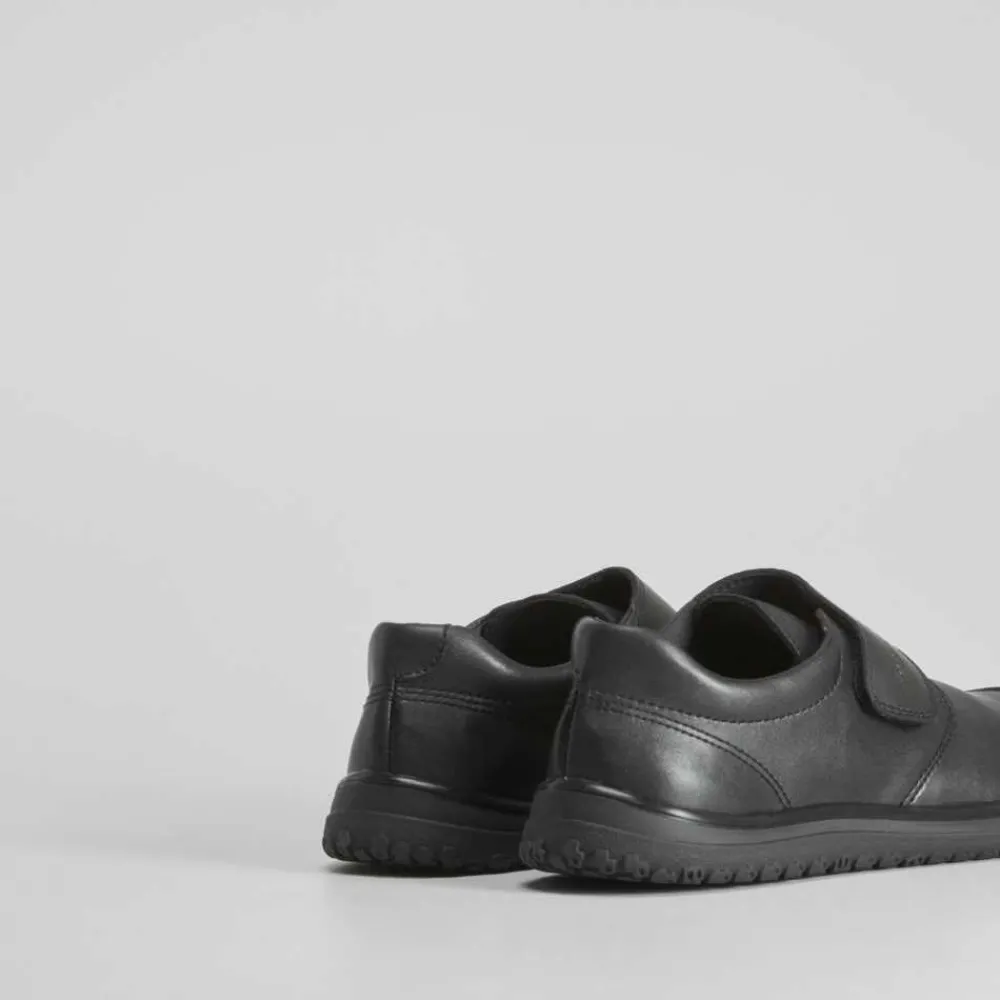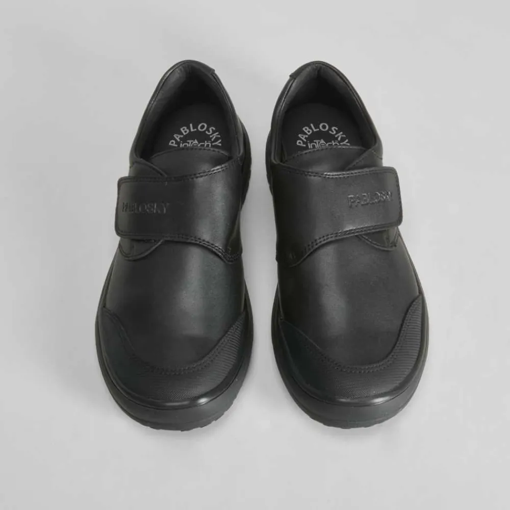 Zapato colegial de piel en color negro de la marca PABLOSKY. Modelo liso con una tira de velcro en empeine y puntera reforzada para mayor resistencia.