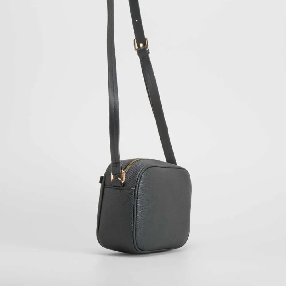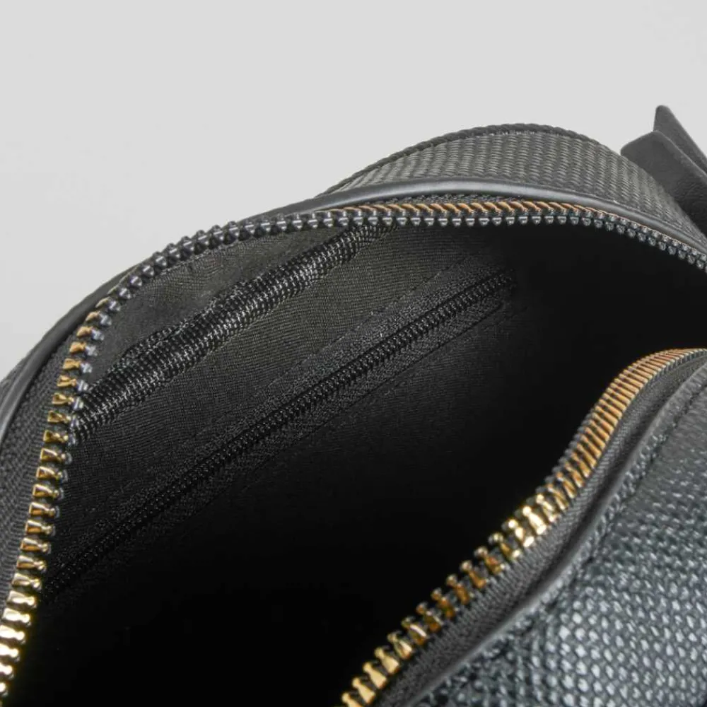 Bolso bandolera negro PICCOLA PIU confeccionado en material sintético con acabado grabado, que aporta textura y elegancia. Incluye un bolsillo exterior funcional con cierre de cremallera, un amplio compartimento principal con forro interior y una correa ajustable para adaptarse a cualquier estilo. Ideal para complementar tus looks sofisticados y modernos.
