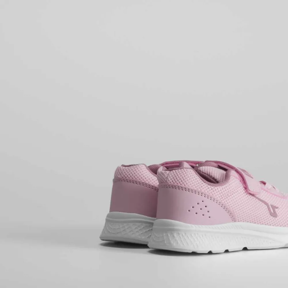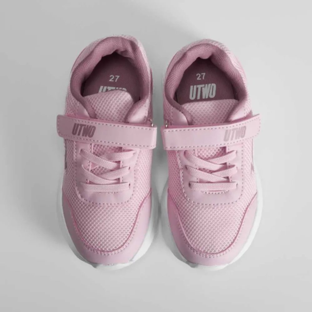 Zapatilla de deporte ligera infantil de la marca UTWO. Modelo en malla flexible con refuerzos en la puntera y el talón. Exterior en color rosa con una tira de velcro y cordones elásticos y suela de phylon ligera y flexible.