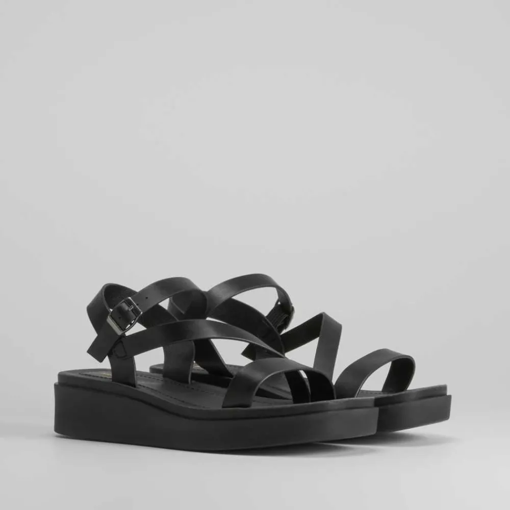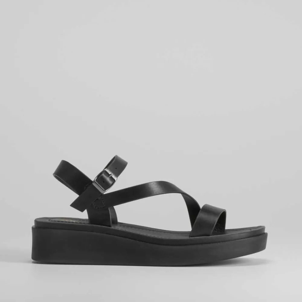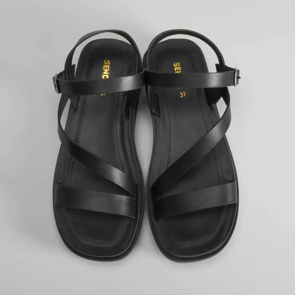 Sandalia negra con plataforma de la marca SENDA ROAD para mujer. Modelo monocolor con una tira diagonal en el empeine y cierre de hebilla.