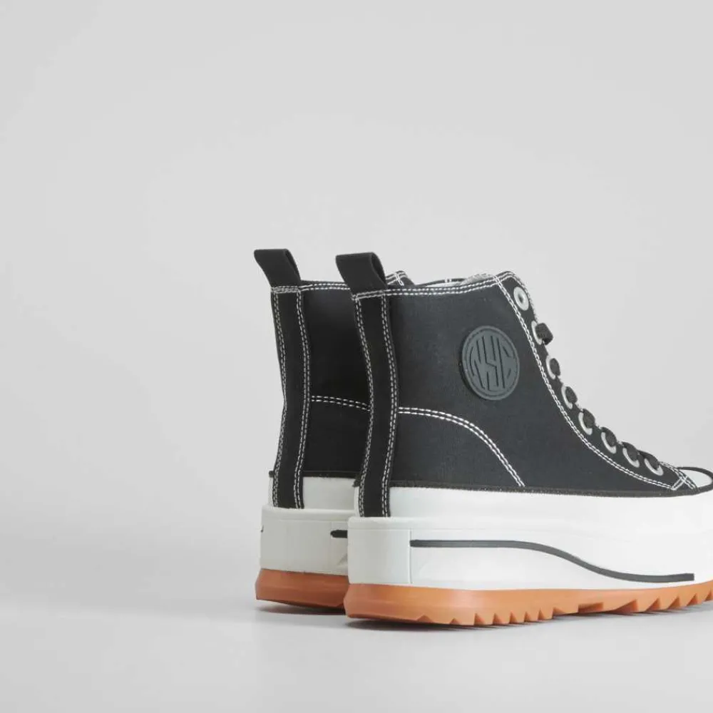 Zapatilla alta negra con plataforma dentada de la marca NYC. Modelo en color negro con pespuntes contrastados, cierre de cordones y tirador trasera. Plataforma adornada con una onda.