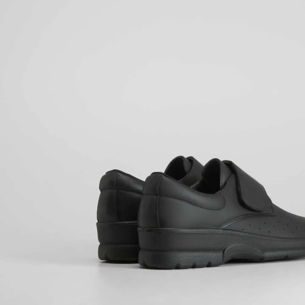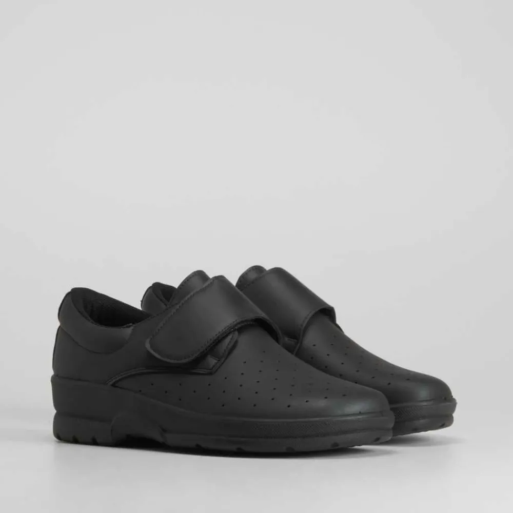Zapato de trabajo cerrado para mujer en color negro de COMFEET SANICARE. Modelo con velcro y perforados en la pala. Plantilla extraíble.