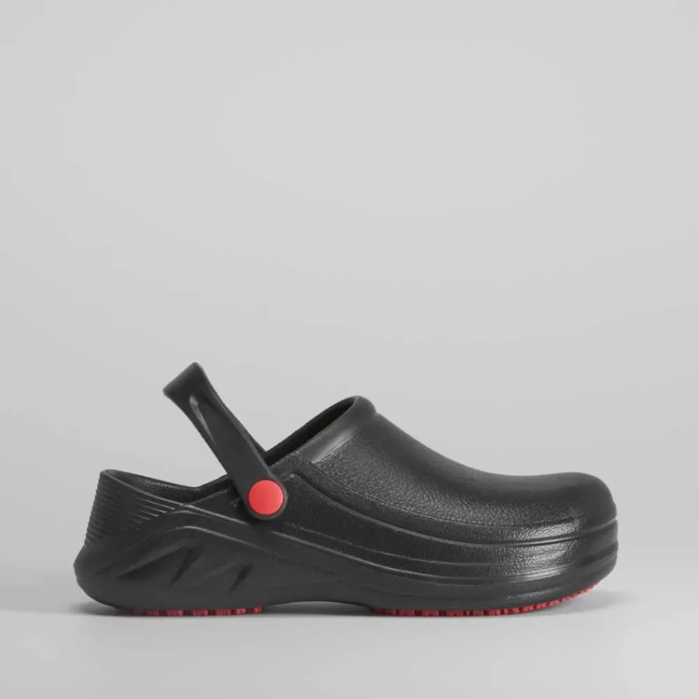 Zueco de trabajo para mujer en color negro de la marca COMFEET SANICARE. Diseño ligero con una tira trasera movible para un mayor ajuste. Plantilla extraíble y suela antideslizante.