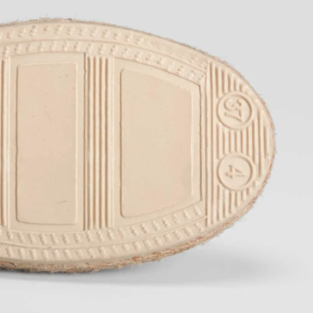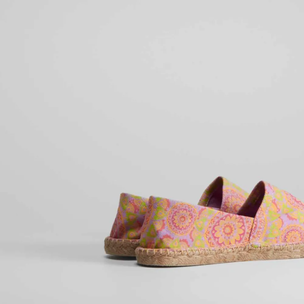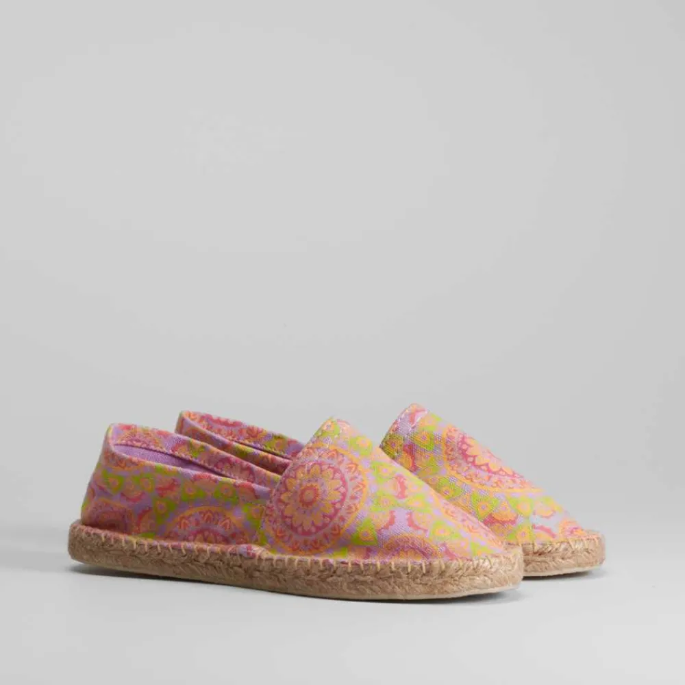 Alpargata básica de mujer con estampado étnico en tonos naranja y piso de esparto de la marca COCONUT DRIVE. Recomendamos coger una talla más de la que utilices habitualmente.