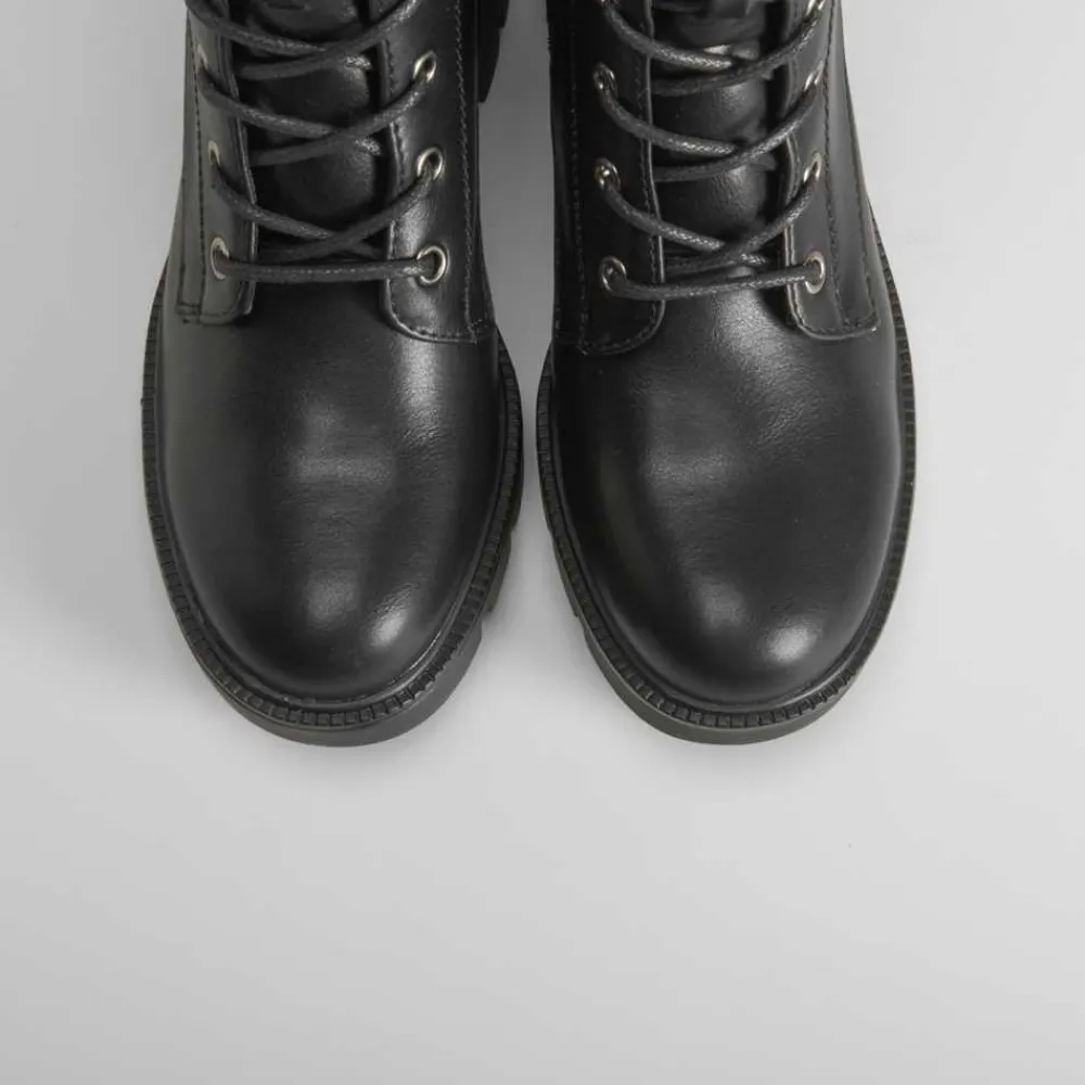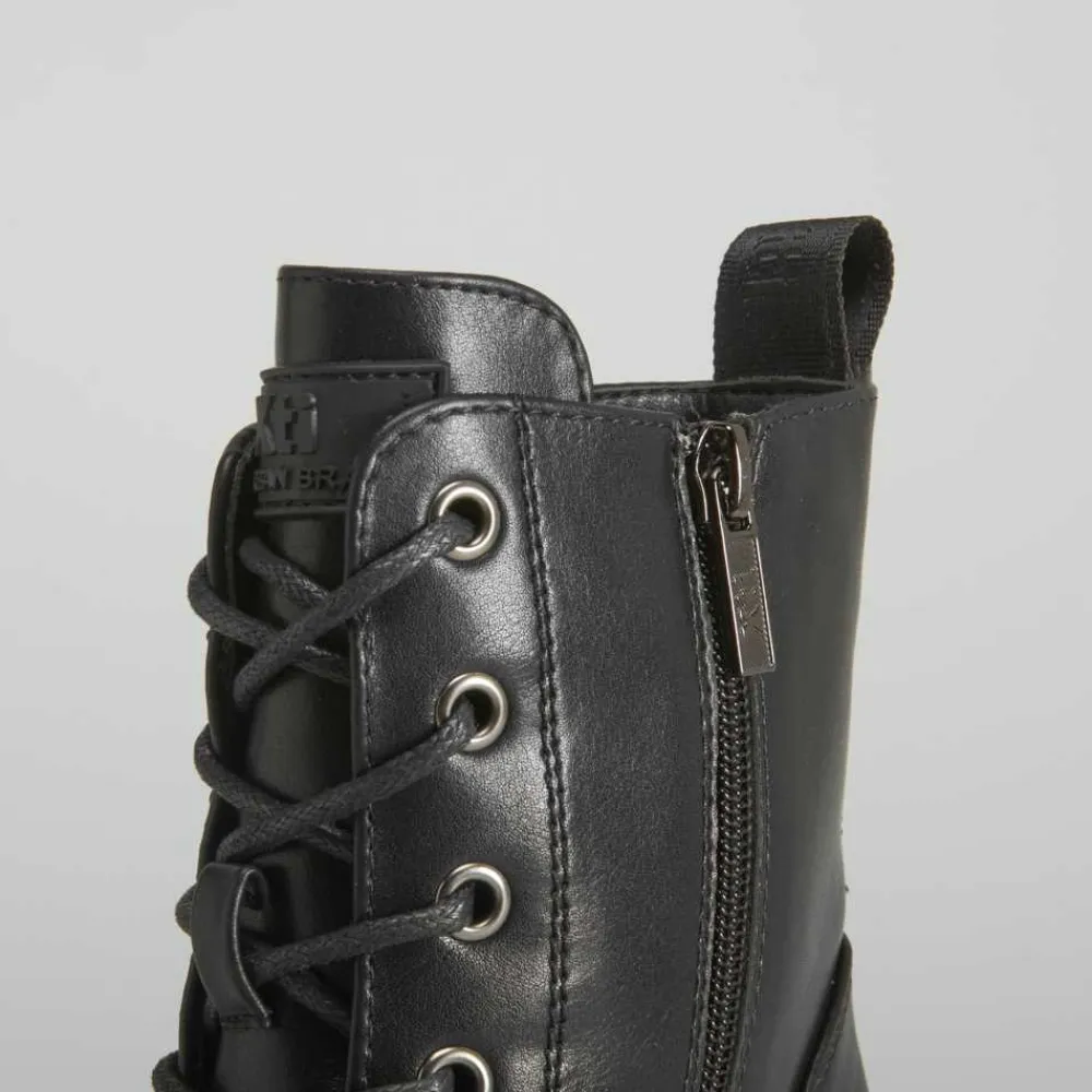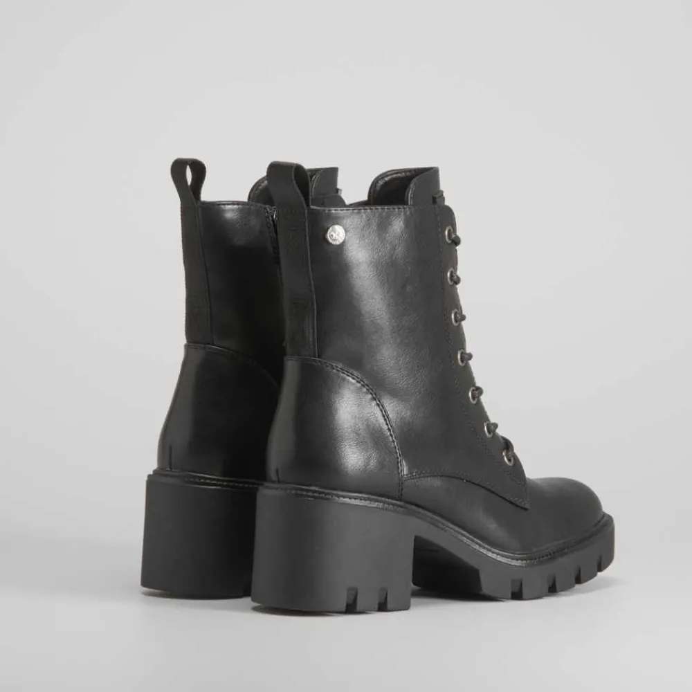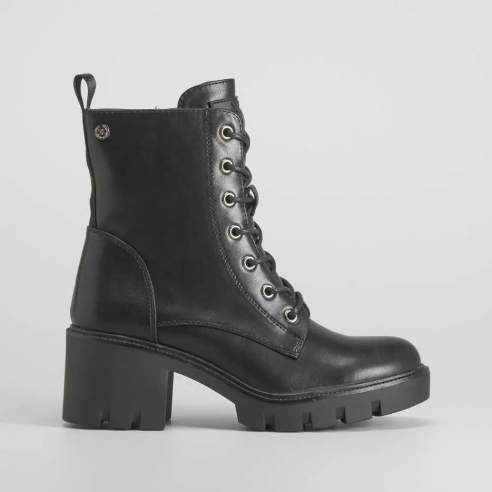 Botín de tacón ancho con suela dentada de la marca XTI. Modelo con cordones encerados, ojales metalizados y cierre de cremallera lateral.
