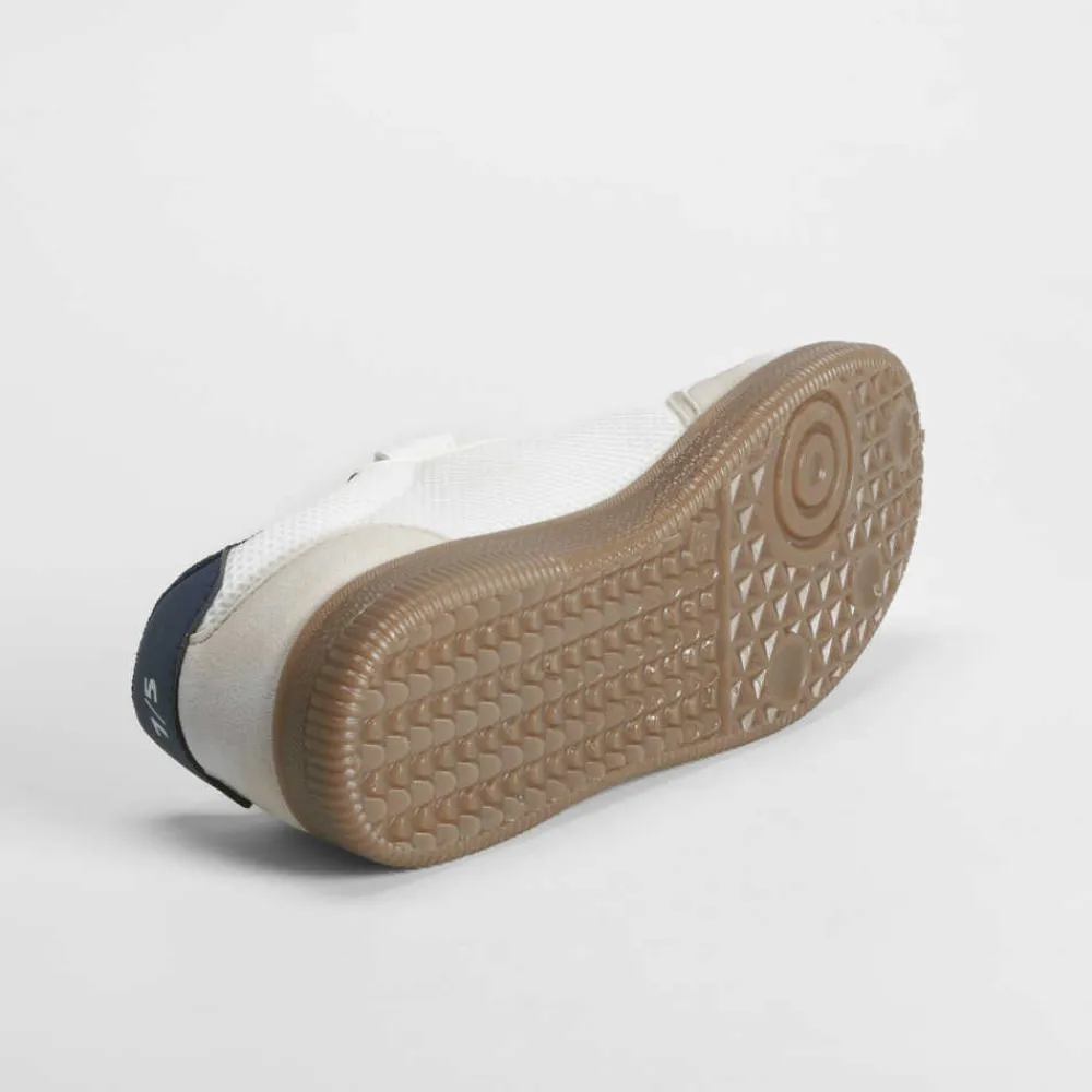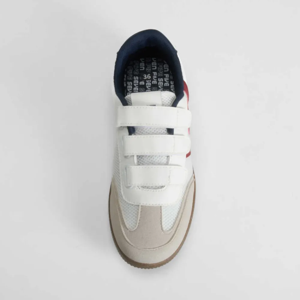Zapatilla de estilo casual en tonos blancos y beige, con detalles rojos y cierre de tiras ajustables. Su diseño deportivo resalta con la suela marrón y el interior azul, brindando comodidad y estilo para uso diario. La marca SEVEN FIVE garantiza calidad y tendencia en cada paso.