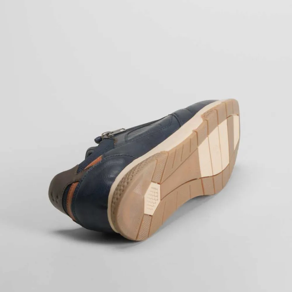 El deportivo urbano con cremallera hexaflex de COMFEET combina diseño contemporáneo y tecnología para acompañarte en tu día a día. Confeccionado en material sintético azul marino con detalles en contraste, destaca por su cremallera lateral que facilita el calce y aporta un toque moderno. La suela con tecnología Hexaflex ofrece máxima flexibilidad, absorción de impactos y una pisada ergonómica que distribuye la presión de forma uniforme.