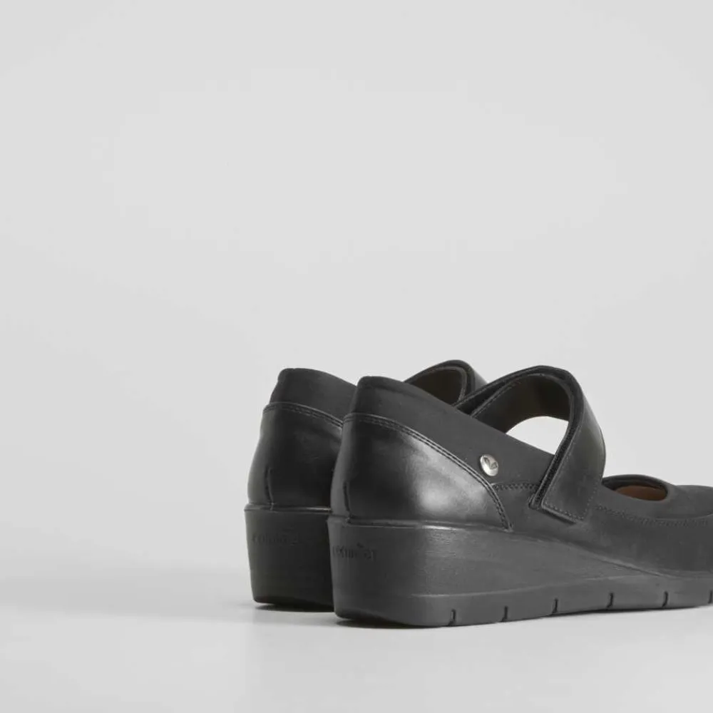 Mercedita con cuña de estilo casual para mujer de la marca COMFEET. Corte en color negro con una pieza de licra muy práctica y confortable, cierre de velcro ajustable y cuña de 4cm de altura. COMFORT+: Incorpora una plantilla ergonómica termoconformada que reparte el peso de manera uniforme y disminuye la presión aliviando así nuestros pies.