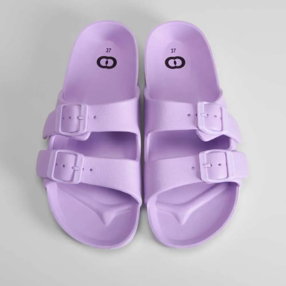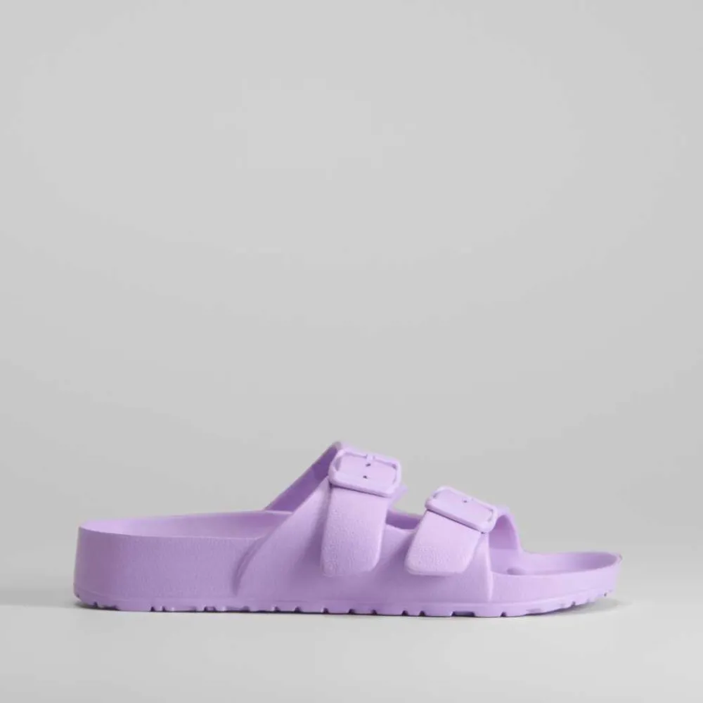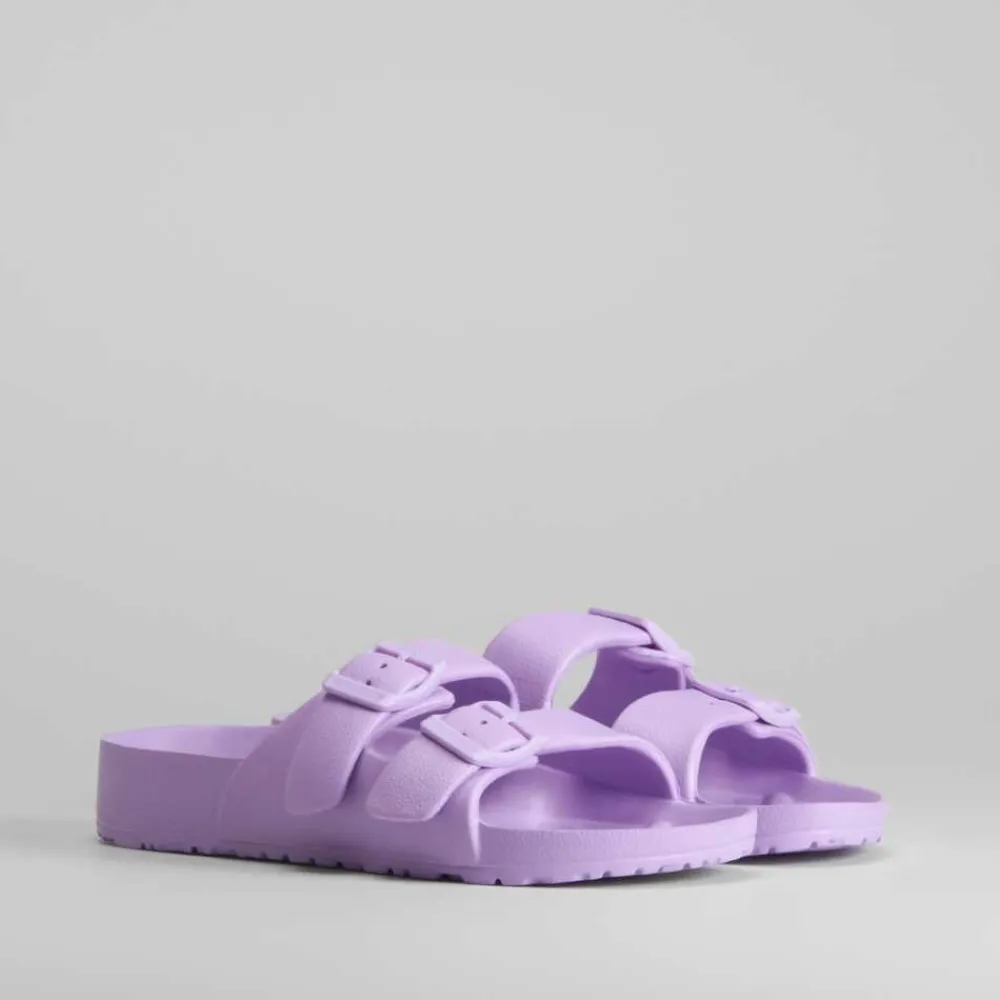 Sandalia bio en eva con dos hebillas en la pala de la marca COCONUT DRIVE. Modelo en color lila.