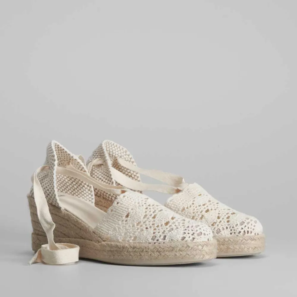 Sandalia de esparto clásica en macramé para mujer de la marca SENDA ROAD. Exterior textil en color blanco con tiras lazadas. Cuña de 7cm de altura.