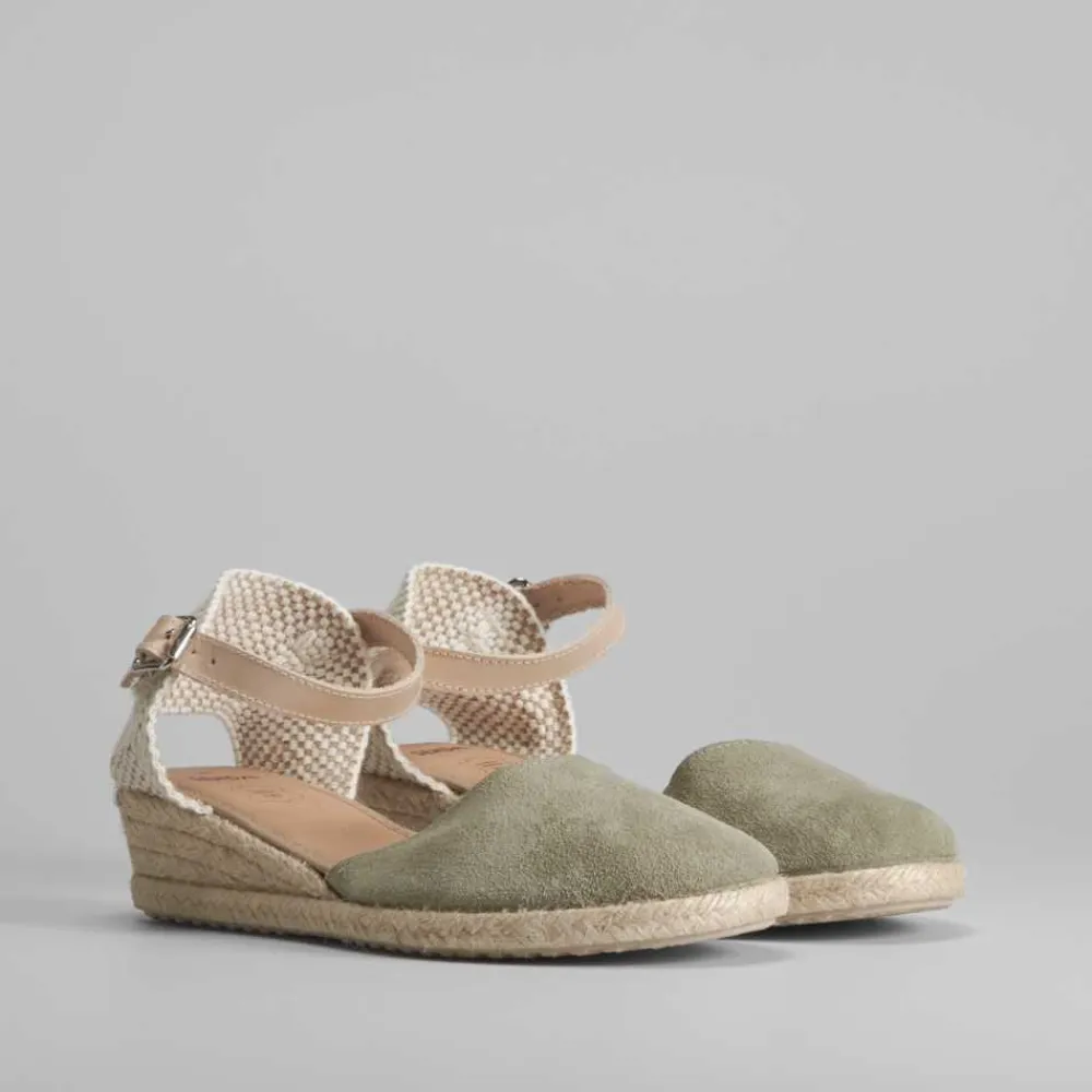 Sandalia de piel para mujer de la marca SENDA ROAD. Modelo en color verde, cierre de hebilla trasero ajustable y suela de yute con cuña de 4cm. Hecho en España.