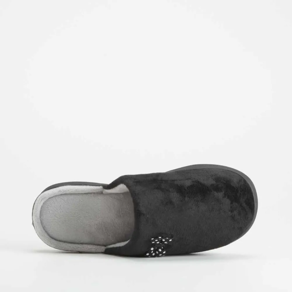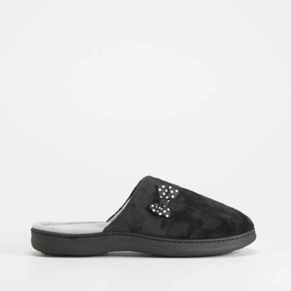 Zapatilla de casa abierta de color negro de la marca OLYNE. Pala textil adornada con un lazo combinado con lunares.