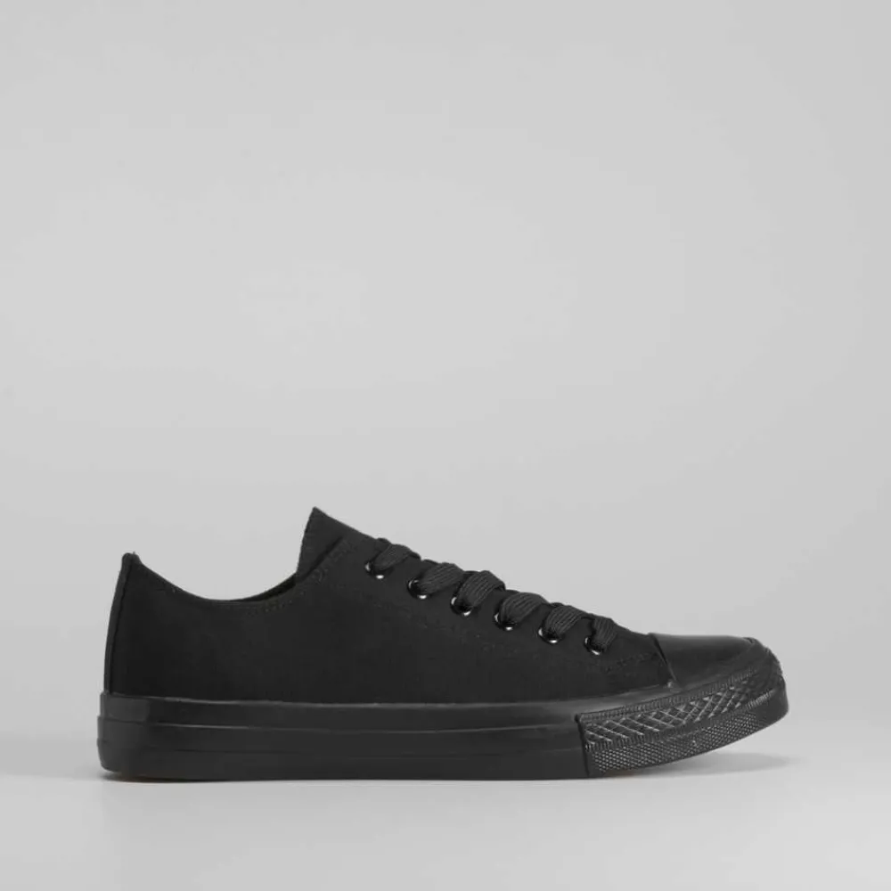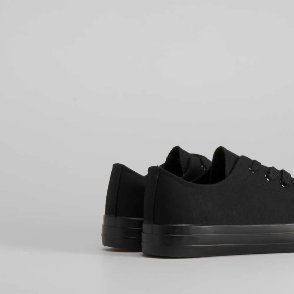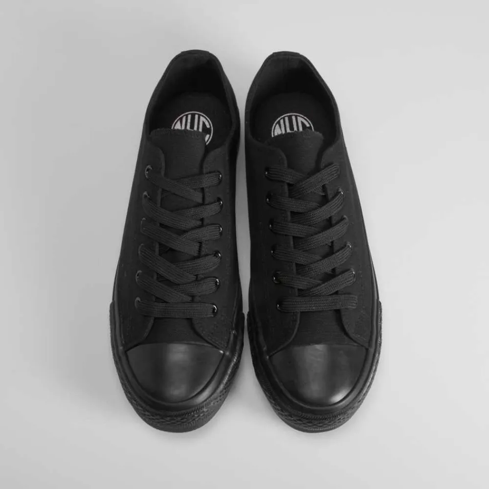 Zapatilla de lona básica de la marca NYC para hombres. Exterior liso en color negro. Cierre de cordones y puntera de caucho.