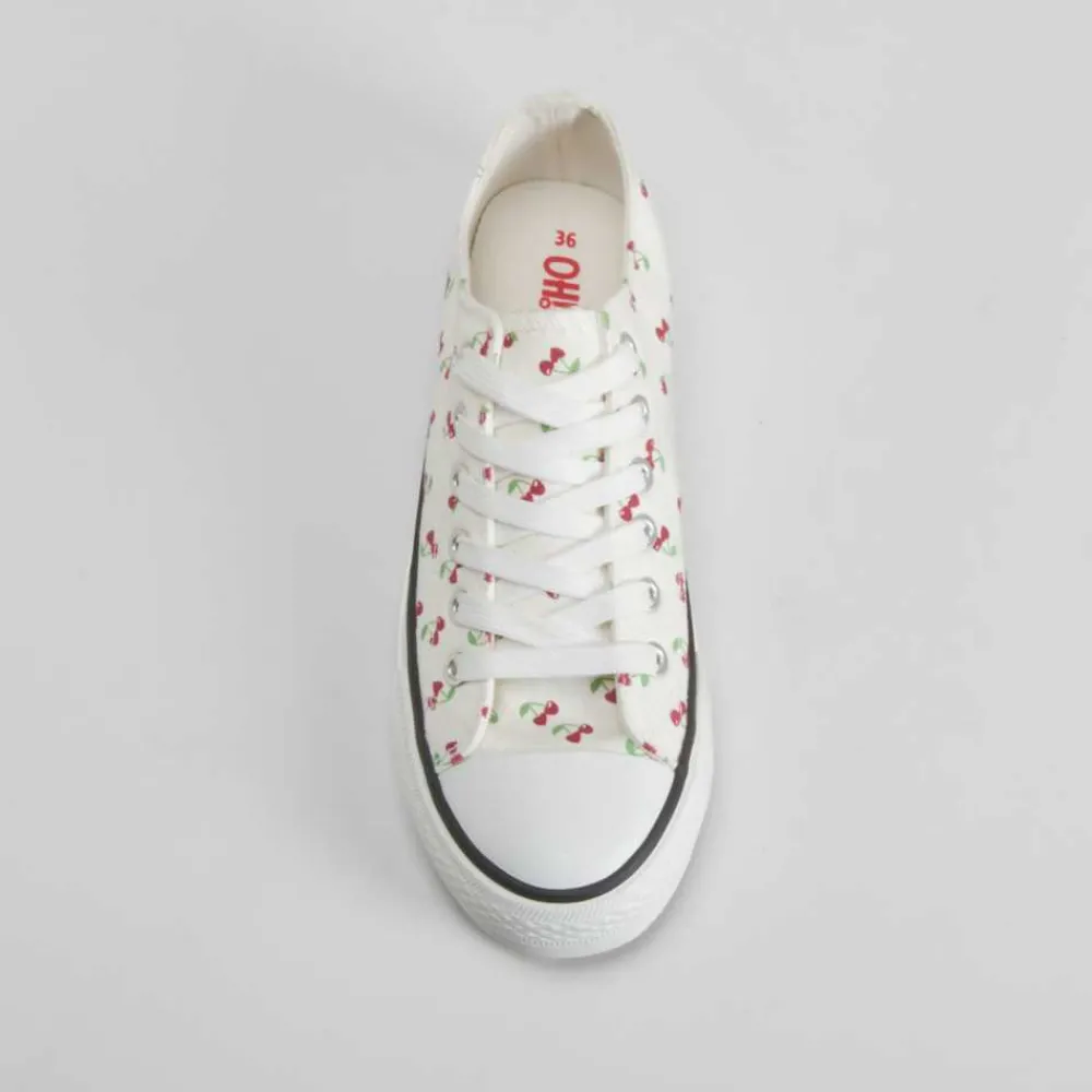 Zapatilla de lona básica de la marca OH GIRL para niños. Exterior en color blanco con estampado de cerezas. Cierre de cordones y puntera de caucho.