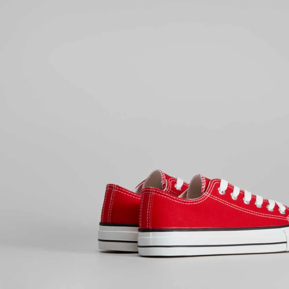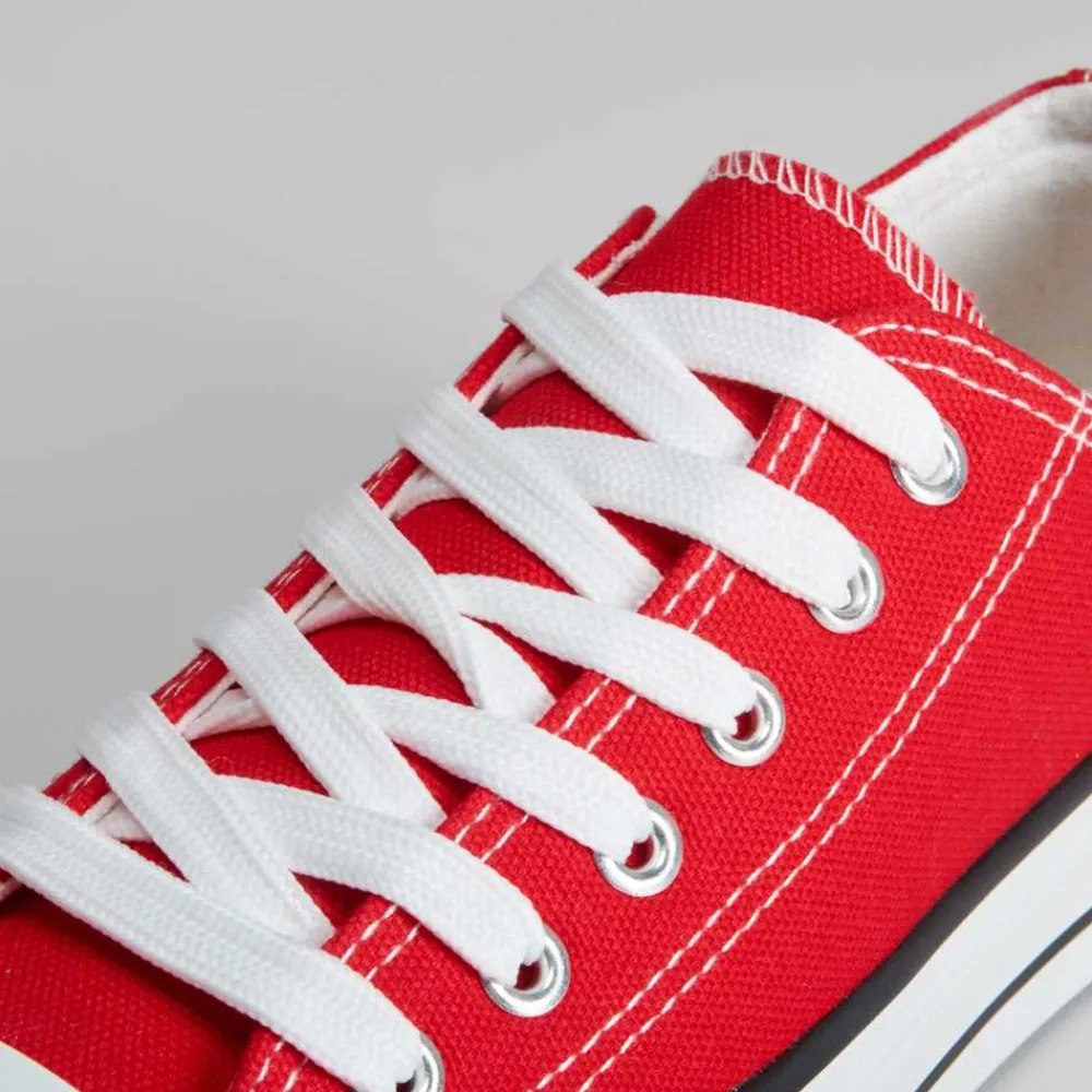 Zapatilla de lona básica de la marca NYC para mujer. Exterior textil liso y sencillo en color rojo. Cierre de cordones y puntera de caucho.